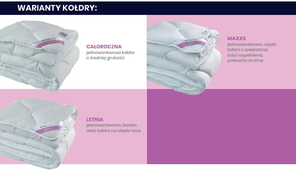 Одеяла HAPPY доступны в 4 вариантах. Ознакомьтесь с нашим ассортиментом и выберите подходящий вам продукт: SUPER LIGHT - легкое одеяло для жаркого летаSUMMER - однослойное, очень легкое одеяло для теплых ночей
