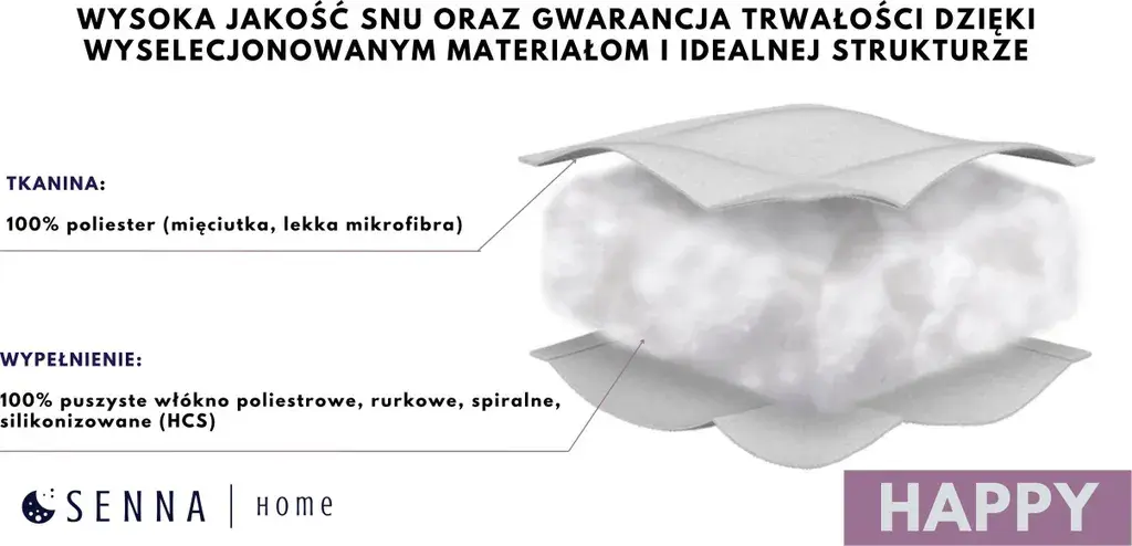 Одеяло Senna Home HAPPY изготовлено из высококачественных, прочных материалов и тщательно изготовлено. Тщательно подобранный рисунок стежки предотвращает смещение наполнителя. Края одеяла отделаны прочной, эстетичной окантовкой. ТКАНЬ: 100% полиэстер (мягкая, легкая микрофибра) Одеяло изготовлено из высококачественной микрофибры, прочной, мягкой и приятной на ощупь. Perfect идеально облегает тело и обеспечивает ощущение укутанности, что способствует спокойному сну. Микрофибра