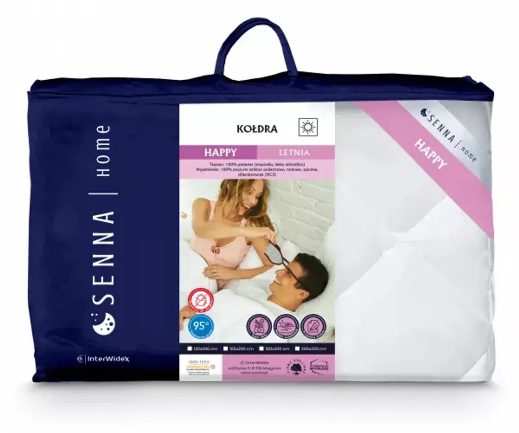 Подробные инструкции по уходу всегда можно найти на этикетке изделия. Ищете другой размер одеяла? Хотите купить подушку из той же коллекции? Одеяло доступно в различных размерах. Коллекция HAPPY также включает подушки разных размеров, так что вы можете создать свой идеальный комплект для сна. Компания Inter Widex предлагает в коллекции Senna Home HAPPY: Одеяла 4 размеров: 135x200 см, 155x200 см, 180x200 см, 200x220 см; Подушки 7 размеров: 40x40 см, 40x60 см, 50x60 см, 50x70 см, 60x60 см, 70x70 см, 70x80 см. Одеяло схожих размеров также есть в коллекции CLASSIC. Одеяло супертонкое и легкое. Идеальная мягкость и обволакивающий комфорт одеяла HAPPY в новой версии SUPER LIGHT. Одеяло Senna Home HAPPY SUPERLIGHT - это однослойное одеяло, изготовленное из отборных, высококачественных и прочных материалов и тщательно обработанное. ТКАНЬ - МИКРОФИБРА, ЛЕГКАЯ И ПРИЯТНАЯ НА ОЩУПЬ. Одеяло изготовлено из высококачественной микрофибры. Микрофибра не только прочная, но и мягкая и приятная на ощупь. Материал идеально прилегает к телу, создавая ощущение укутанности - это не только делает сон более комфортным, но и способствует более быстрому засыпанию. Кроме того, микрофибра обладает отличной воздухопроницаемостью благодаря микроперфорации, которая пропускает воздух и при этом отлично впитывает влагу.