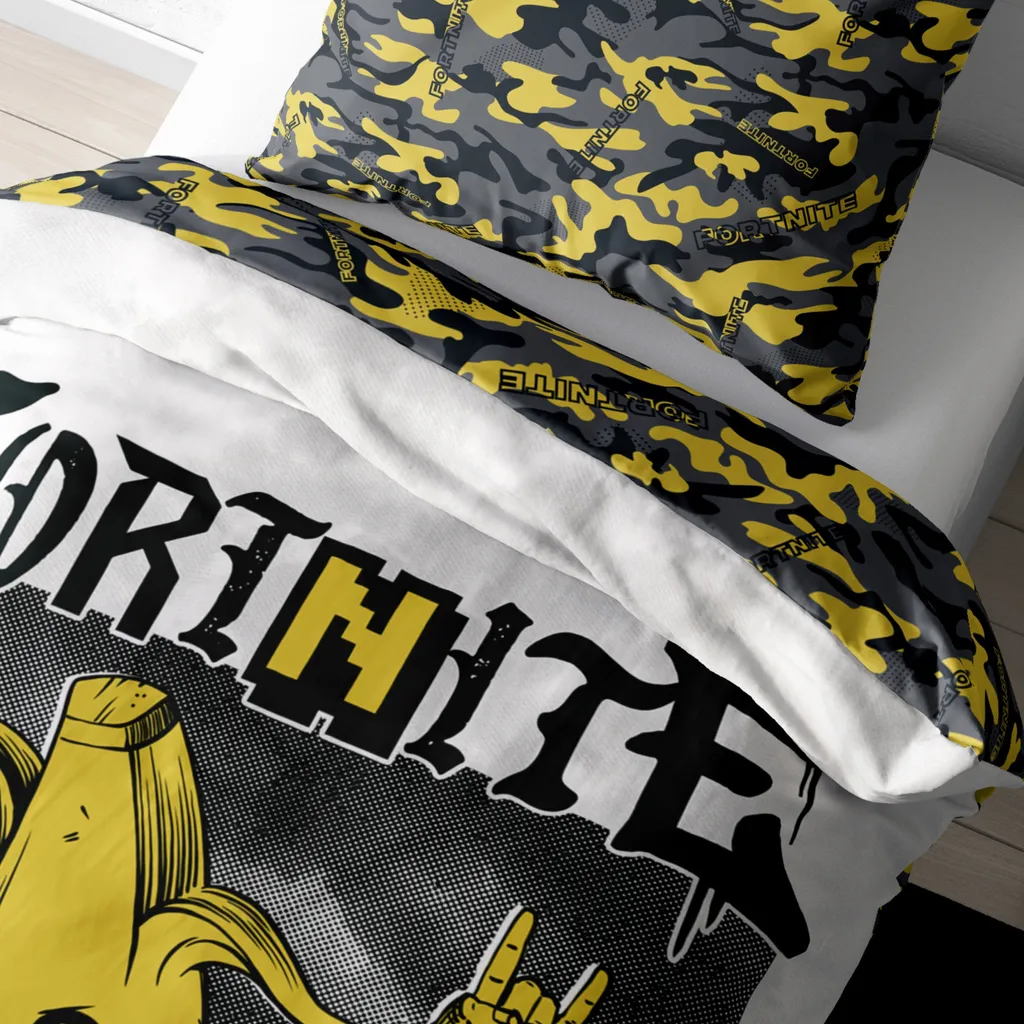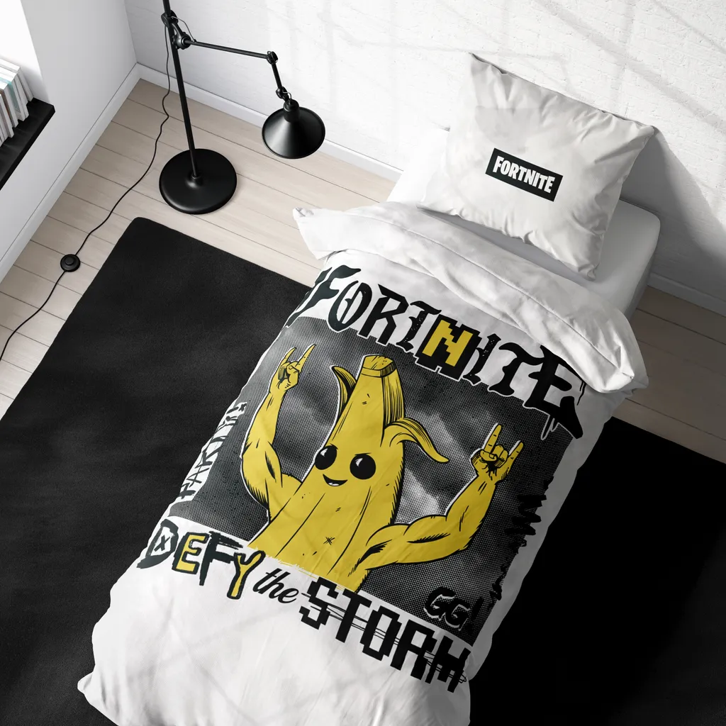 Привнесите юмор и действие Fortnite прямо в свою спальню с этим классным Banana Постельное белье Бросай вызов! Этот привлекательный дизайн изображает культового персонажа Fortnite Пили, забавного банана, в динамичной позе, которая мгновенно вызовет улыбку на лице любого фаната. Яркие цвета и динамичные элементы создают настоящую атмосферу Fortnite.