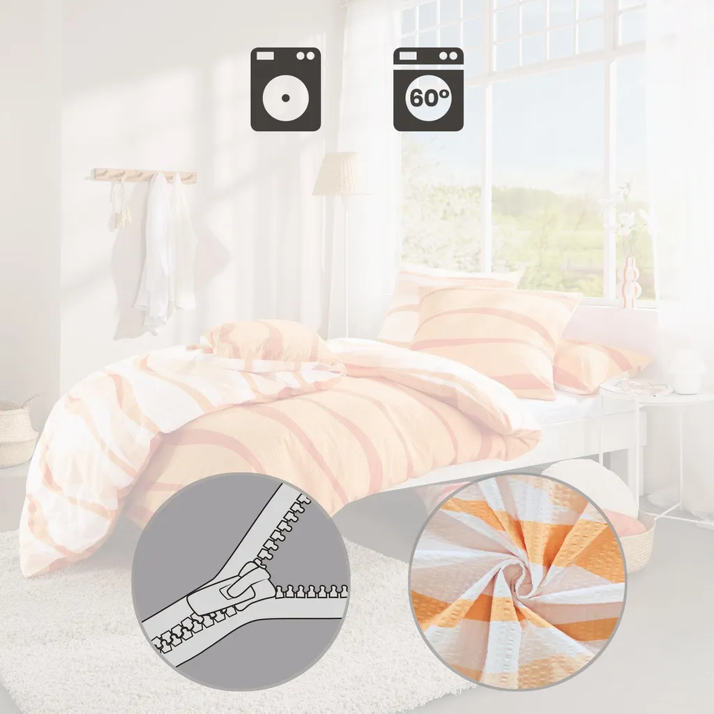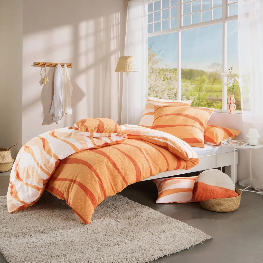 Наволочка из сирсакера Erwin Müller с двусторонним дизайном. Графический волнистый рисунок добавляет свежий, яркий штрих. Двухцветный дизайн создает красивый контраст. Особенно летом вы оцените эту приятную легкость, термо- и влагорегулирующую ткань с устойчивым жатым эффектом. Она не только приятна для кожи и дышащая, но и быстросохнущая, не мнется и легко заменяется благодаря застежке-молнии.
