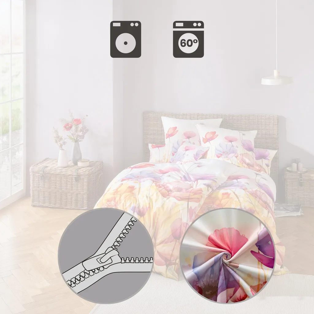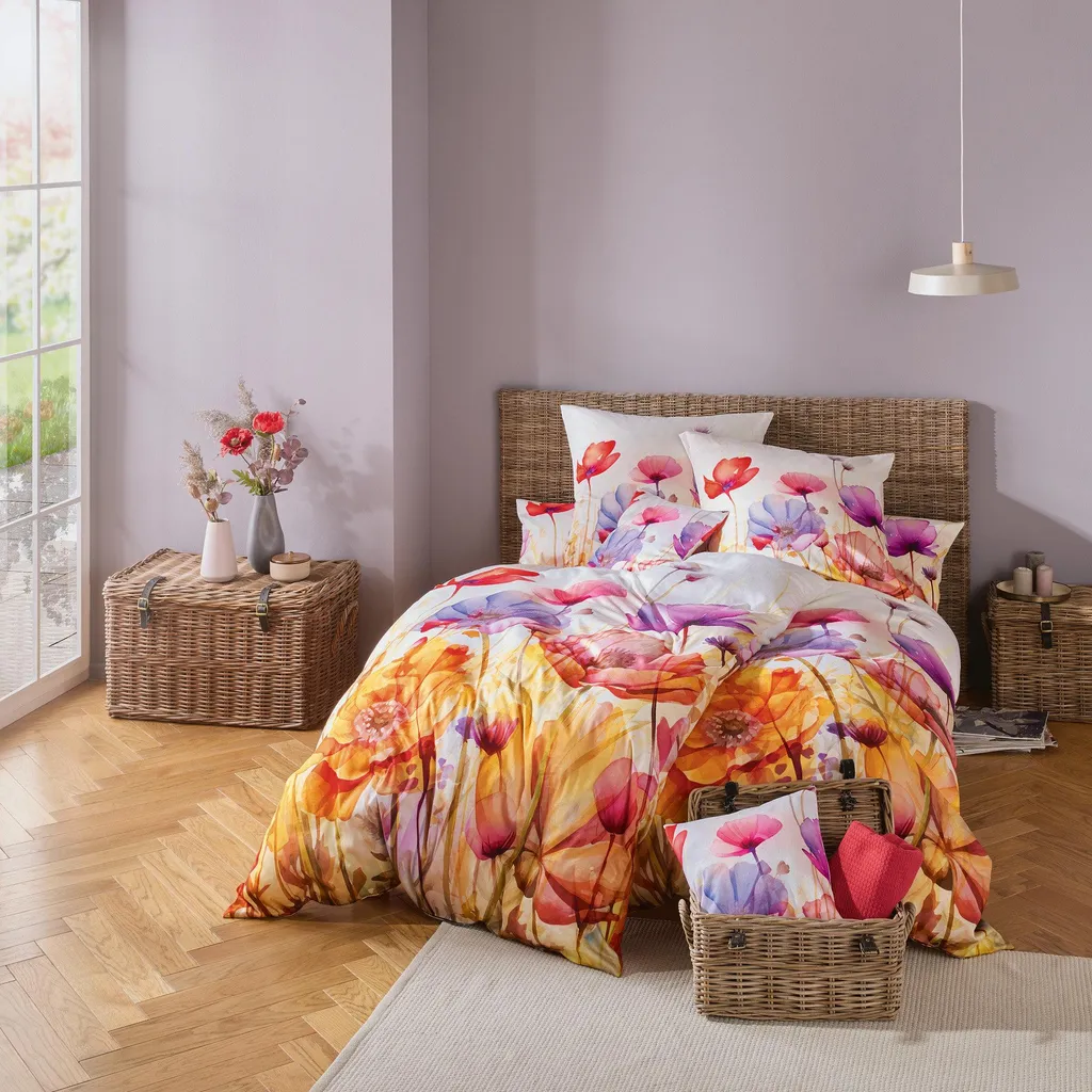Наволочка Erwin Müller Mako из атласа. Красочные маки в акварельном стиле наполнят вашу спальню летним настроением. Высококачественная цифровая печать придает дизайну стойкую яркость красок. Насладитесь расслабляющим и восстанавливающим комфортом сна в этой шелковистой, плотной и элегантно мерцающей ткани. Побалуйте себя чувственными ощущениями от этой ткани. Гладкая, эластичная ткань не только дышащая, приятная для кожи и терморегулирующая, но также долговечная и простая в уходе.