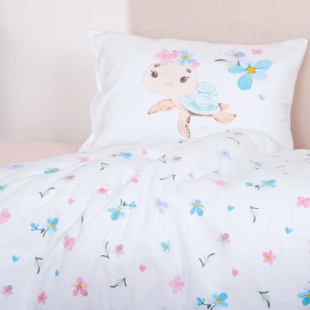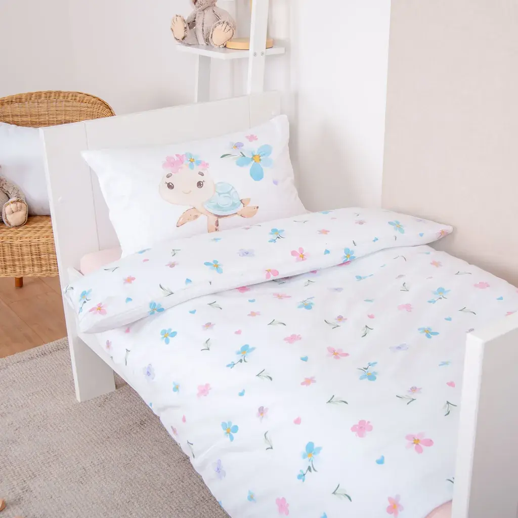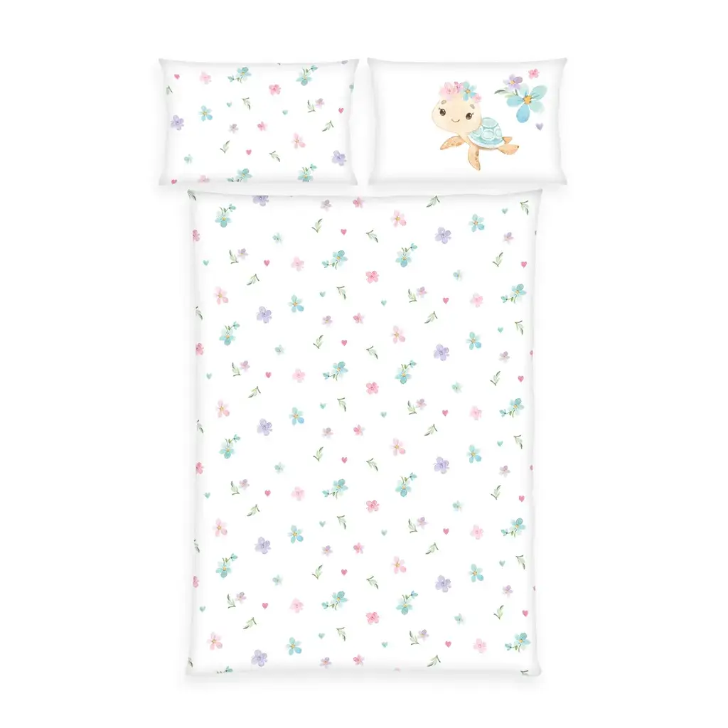 Это мягкое постельное белье с популярным рисунком маленькой черепахи станет настоящей приманкой для глаз в любой детской комнате и идеально подойдет в качестве подарка. Благодаря адаптированному размеру это постельное белье для малышей идеально подходит для использования в дорожных кроватках, детских люльках и детских кроватках.