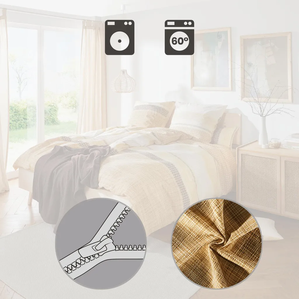 Наволочка из жатого хлопка Erwin Müller. Графичные полоски, гармоничные цвета и двусторонний дизайн наполнят вашу комнату свежестью. Вы быстро оцените его простоту в уходе: это простое постельное белье практически не мнется - просто постирайте, высушите и легко наденьте обратно благодаря молнии.