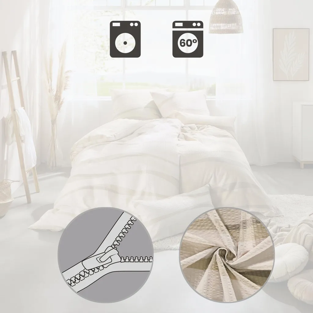 Erwin Müller Наволочка из сирсакера с двусторонним дизайном. Графический волнистый рисунок добавляет свежий, яркий штрих. Двухцветный дизайн создает красивый контраст. Особенно летом вы оцените эту приятную легкость, термо- и влагорегулирующую ткань с ее прочным жатым эффектом. Она не только приятна для кожи и дышащая, но также быстросохнущая, не мнется и легко заменяется благодаря застежке-молнии. Характеристики продукта: - Двусторонняя наволочка - Новый цвет - Графический дизайн - Качество: сирсакер с характерной жатой текстурой - Фирменная молния - Не требует глажки - Гипоаллергенный - Материал: 100% хлопок (BW) - Инструкции по стирке: - Стирать при 60°C - Не отбеливать - Сушить в стиральной машине при низкой температуре - Не гладить - Не подвергать химчистке