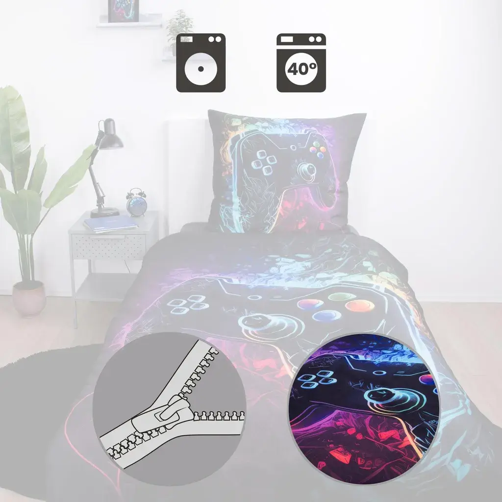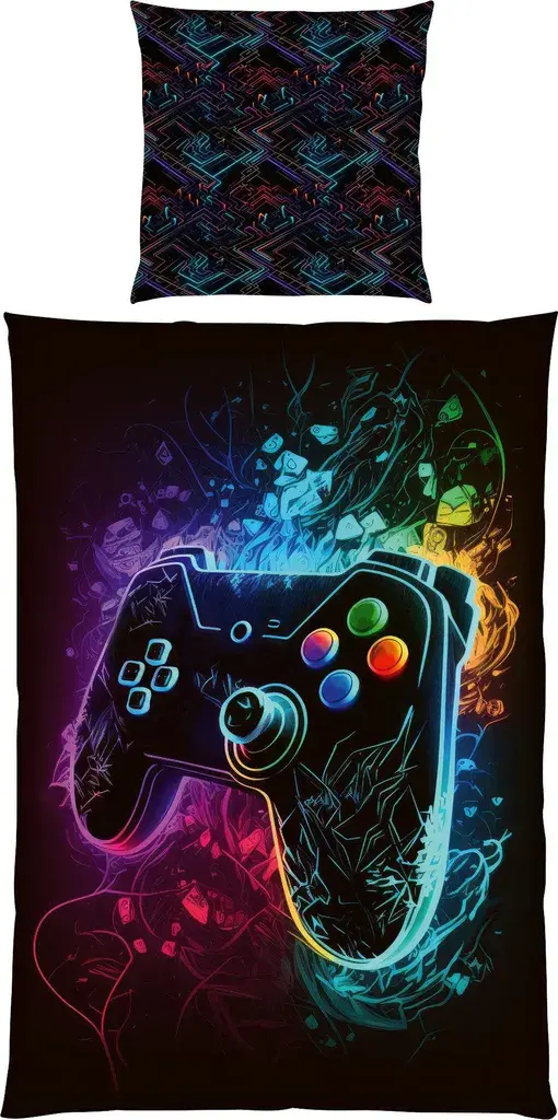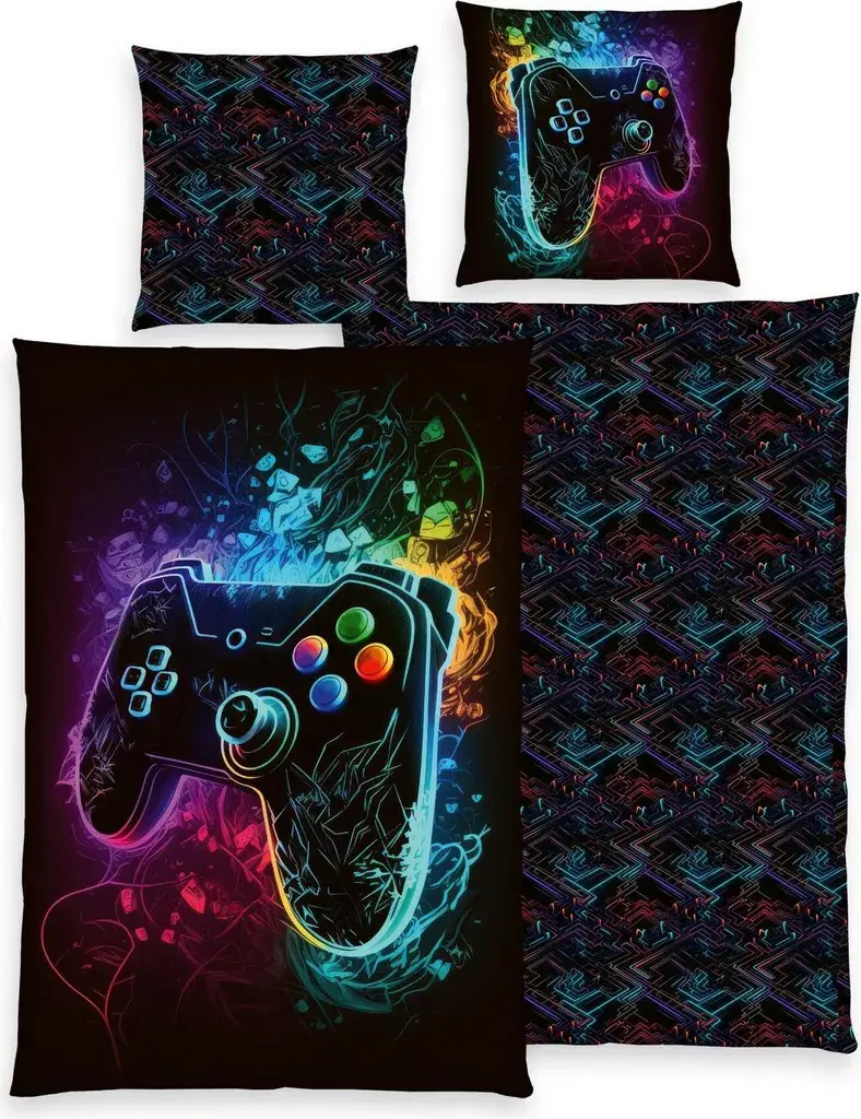 Постельное белье из микрофибры GAMING: комфорт встречается со стилем Это постельное белье было специально разработано для тех, кто ценит не только комфорт, но и современный дизайн. Используемый хлопок обеспечивает приятные ощущения и особенно прост в уходе. Благодаря дышащим свойствам материала вы будете наслаждаться комфортным климатом для сна, способствующим спокойному сну. Идеально подходит для геймеров и ценителей дизайна, которые не хотят идти на компромиссы в вопросах стиля, даже в спальне. Детский двусторонний комплект постельного белья Herding из микрофибры Gaming. Крутой контроллер ярких неоновых цветов на черном фоне - настоящая приманка для глаз. Обратная сторона украшена геометрическим узором в тон. Цвета на шелковистой ткани выглядят особенно эффектно. Микрофибра дышащая, легкая, немнущаяся, прочная, мягкая и износостойкая. Благодаря своим влагорегулирующим свойствам она создает комфортные условия для сна. Это постельное белье, не требующее особого ухода, быстро сохнет, поэтому его можно быстро положить обратно на кровать. Благодаря молнии сменить постельное белье будет легко. Характеристики продукта: - Двустороннее постельное белье - с дизайном - Качество: Микрофибра - с фирменной молнией - Материал: 100% полиэстер (PES)