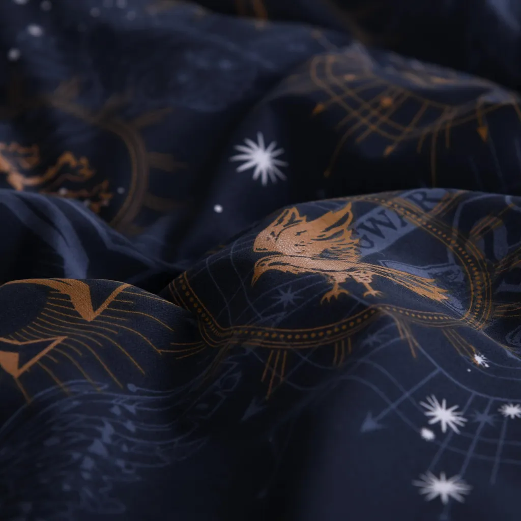 Размер наволочки: 80 х 80 см Размер пододеяльника: 135 х 200 см Материал: Хлопок Описание материала (название,%): 100% Хлопок Это темно-синее перкалевое постельное белье из 100% хлопка позволит вам погрузиться в мир Гарри Поттера. Цветовое сочетание темно-синих и золотых аппликаций придает постельному белью особенно шикарный вид. Практичные молнии обеспечивают быструю и легкую смену. Подробности: Материал: 100% Хлопок Качество: Перкаль - это тонкая, плотная и эластичная ткань. Она прочная, долговечная и сохраняет свою форму и цвет даже после многих стирок. Инструкции по уходу: Можно сушить в стиральной машине, Стирать при температуре до 60 °C: Standard 100. Почувствуйте волшебство Гарри Поттера в своей спальне с нашим изысканным постельным бельем Harry Potter - звездами из 100% хлопка. Это темно-синее постельное белье с Гарри Поттером - подарок, который заставит сердца всех поклонников Гарри Поттера биться чаще. Удивите своих близких этим уникальным и элегантным подарком, который выведет их связь с волшебным миром Гарри Поттера на новый уровень. Практичная застежка на кнопки позволяет легко сменить постельное белье. Постельное белье можно стирать в стиральной машине. Ощутите магию Гарри Поттера у себя в спальне. Закажите постельное белье Harry Potter сегодня и позвольте своим мечтам сбыться в мире, полном волшебства и приключений.