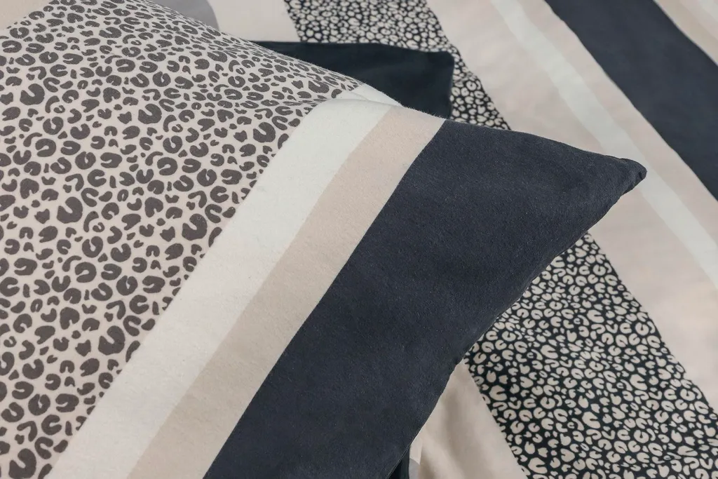 Ощутите комфортный сон с Esprit Bedding E-LEO STRIPE. Это стильное постельное белье сочетает в себе уникальный дизайн черных и бежевых полос с легким леопардовым принтом, добавляя нотку элегантности любой спальне. Естественный основной цвет создает успокаивающую атмосферу, а высококачественная ткань из 100% хлопка обеспечивает приятные ощущения для кожи. Пододеяльник (135 x 200 см) и наволочка (80 x 80 см) предлагают достаточно места для спокойного сна.