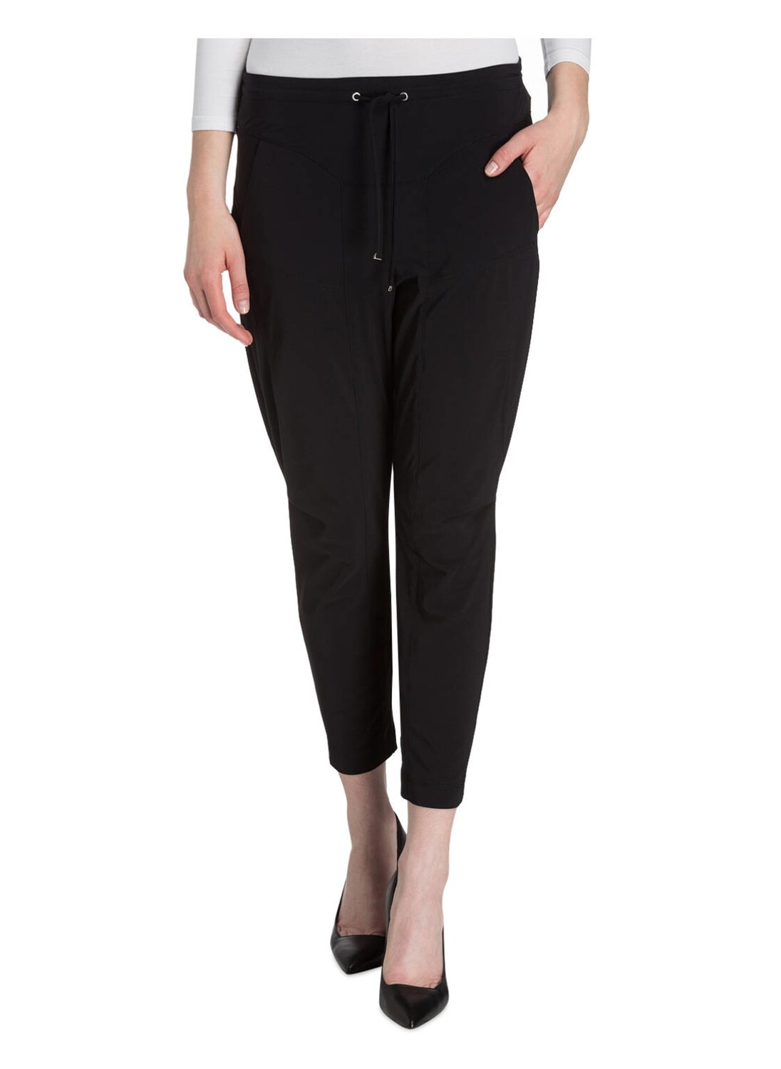 Бренд: RAFFAELLO ROSSI Цвет: черный Посадка по данным производителя: Легкая посадка Нормальная высота талии Узкие зауженные брючины длиной 7/8 Боковые карманы Пояс с кулиской Разделительные швы Легкие, повседневные и эластичные: брюки GIRA 7/8 от RAFFAELLO ROSSI удобны в носке. в элегантном стиле Style. Широкий крой, современные разделительные швы и зауженная брючина делают эту модель абсолютным трендом. Эластан и кулиска на поясе обеспечивают идеальную посадку. В сочетании с непринужденными балетками вас ждет успешный поход по магазинам. Для современного образа! Детали: Внешний материал: 72% полиамид, 28% эластан