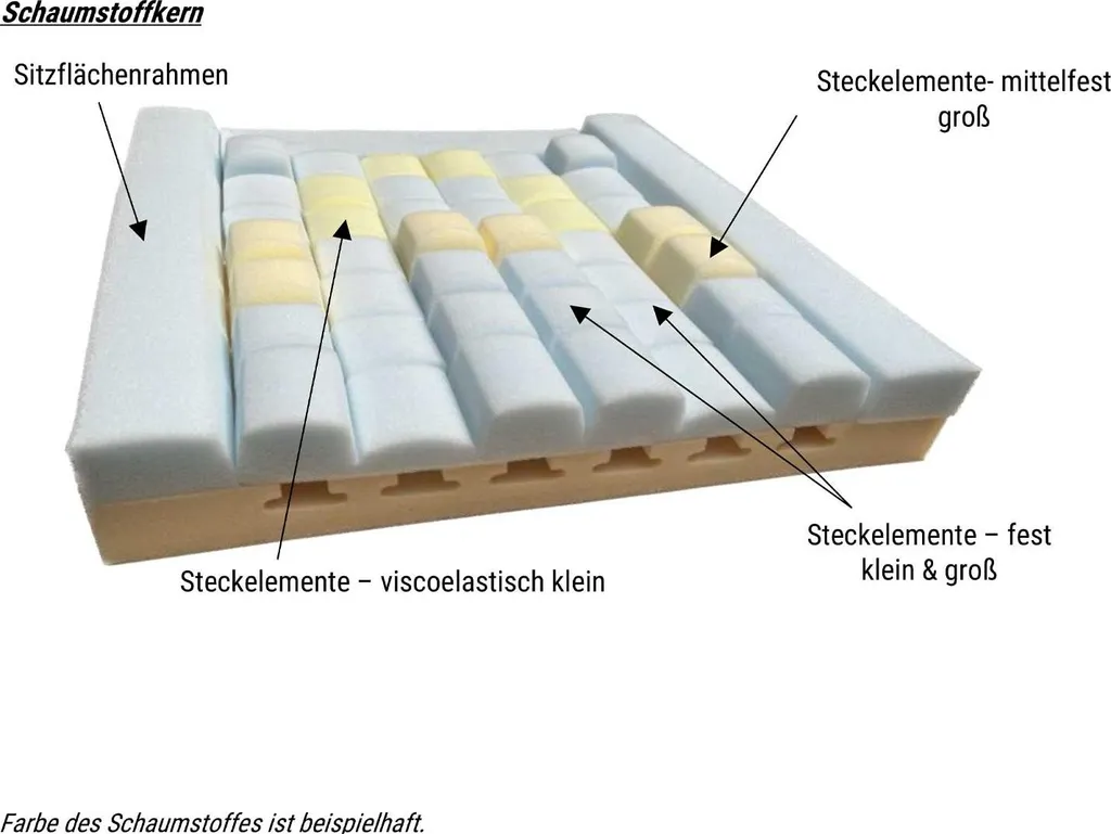 Поверхность сиденья состоит из кубиков, изготовленных из пеноматериала различного качества и доступных в двух вариантах высоты. Расположение этих пеноматериальных кубиков образует структурированную поверхность сиденья. Пеноматериальные кубики можно заменять или снимать по отдельности, что позволяет индивидуально адаптировать поверхность сиденья к потребностям пользователя. Структурированная поверхность сиденья с контуром седла предотвращает скольжение пользователя вперед. Подушка от пролежней для профилактики и поддержки терапии. Подушка для инвалидной коляски CUBE Flexi подходит для профилактики пролежней (до оценки риска очень высокого уровня) и поддержки терапии до категории IV включительно (согласно EPUAP) в сочетании с другими причинными и местными терапевтическими мерами. Материал: пенополиуретан. Уход: подушку можно чистить дезинфицирующими салфетками, то есть протирая ее тканью, смоченной дезинфицирующим средством. Кроме того, при необходимости наполнитель подушки можно чистить обычными бытовыми средствами.