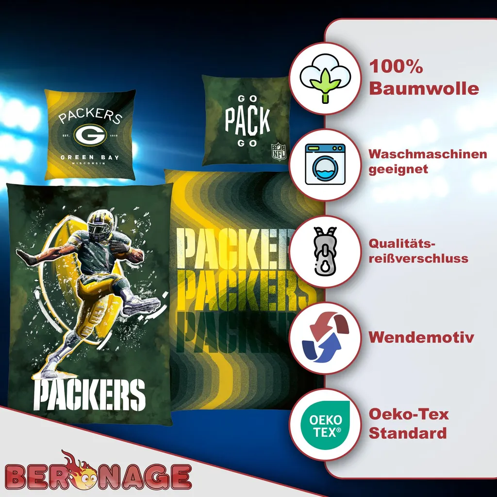 МАТЕРИАЛ - Пододеяльник для фанатов NFL "GO PACK GO" приятен для кожи и воздухопроницаем, изготовлен из 100% хлопка с гладким перкалево-льняным плетением, создавая здоровую среду для сна круглый год. Это постельное белье NFL, конечно же, имеет маркировку 21.HCN.77179 HOHENSTEIN.