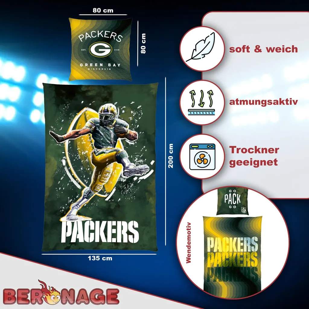 КОМПЛЕКТ ПОСТАВКИ - Этот двусторонний комплект постельного белья Национальной футбольной лиги включает в себя один пододеяльник размером 135x200 см и одну наволочку размером 80x80 см. Комплект постельного белья Green Bay Packers подходит для всех сезонов (весна, лето, осень и зима). Качество изготовления очень высокое, и оно постоянно контролируется.