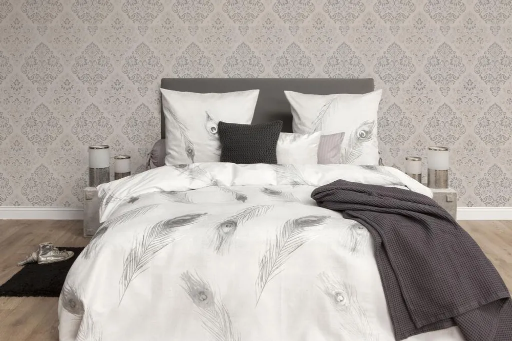 Постельное белье HnL Satin "Denzel" очаровывает стильным, нежным принтом в виде павлиньих перьев серого цвета. Комплект из 2 предметов (пододеяльник и наволочка) изготовлен из 100% хлопка высококачественного сатинового переплетения.