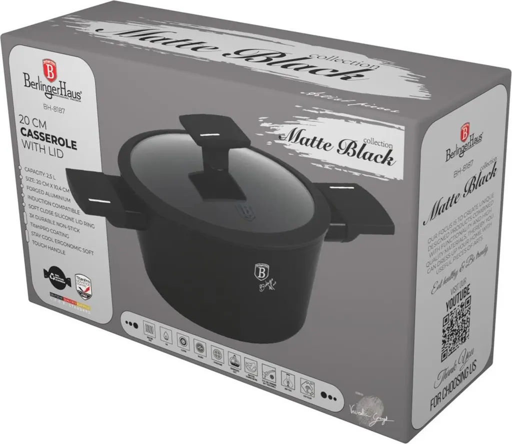Кастрюля BerlingerHaus диаметром 20 см в элегантном матовом черном цвете разработана для интенсивного использования и профессионального вида. Идеально подходит для медленного приготовления, жарки или тушения мяса, овощей и запеканок. В комплекте стеклянная крышка с отверстием для выхода пара для идеальной видимости процесса приготовления.