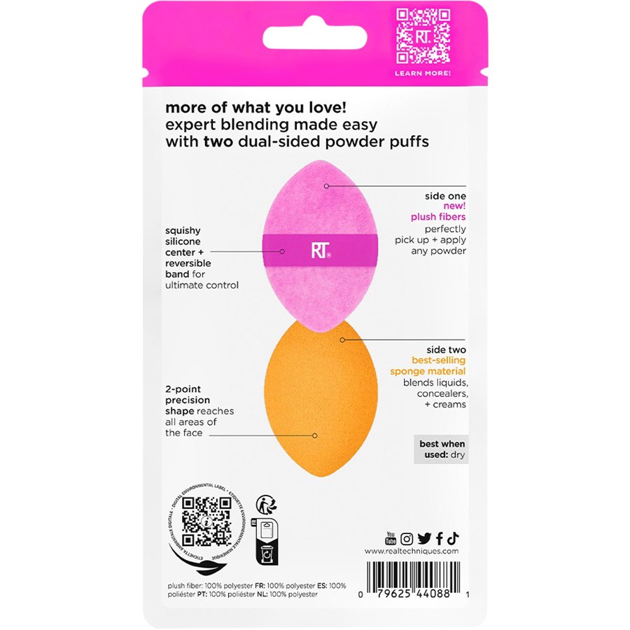 Среди наборов спонжей Real Techniques этот набор из двух спонжей в форме оливы особенно многофункционален. Miracle 2-in-1 Powder Puff Duo 2 Pack имеет одну сторону для сухого макияжа и одну для растушевки кремовых, влажных или жидких текстур. Мягкий материал можно стирать, поэтому его можно использовать повторно. Удобные наборы спонжей для бережной растушевки макияжа любой текстуры. Real Techniques предлагает спонжи с двумя разными сторонами для легкого и точного нанесения макияжа. Розовая, плюшевая сторона Miracle 2-in-1 Powder Puff Duo 2 Pack может использоваться для набора и растушевки небольшого количества пудры или румян. Кончики спонжа идеально подходят для небольших корректировок. Вторая, оранжевая сторона изготовлена из пористого материала спонжа. Это позволяет легко растушевывать кремовые, компактные пудры и подобные продукты, или - опять же, с помощью кончика - наносить их точно. Особенностью двух спонжей Real Techniques является их силиконовая сердцевина. Благодаря этому каждый спонж из набора Miracle 2-in-1 Powder Puff Duo 2 Pack гибок. Нанесение косметических средств становится легким даже на труднодоступных участках лица или зоны декольте. Рука легко скользит под петлей этого набора спонжей, предотвращая скольжение и падение. Очистка проста: достаточно смыть чистой водой с мягким гелем для душа.
