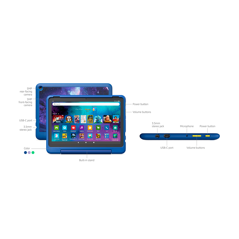 Самый большой детский планшет Amazon поставляется в массивном пластиковом корпусе с встроенной подставкой, что делает его удобным для использования. Однако это не единственная его защита. Программа привязана к Amazon Kids и включает функции родительского контроля, что позволяет оставлять устройство в руках детей, не опасаясь, что они установят игры, вызывающие ночные кошмары.
