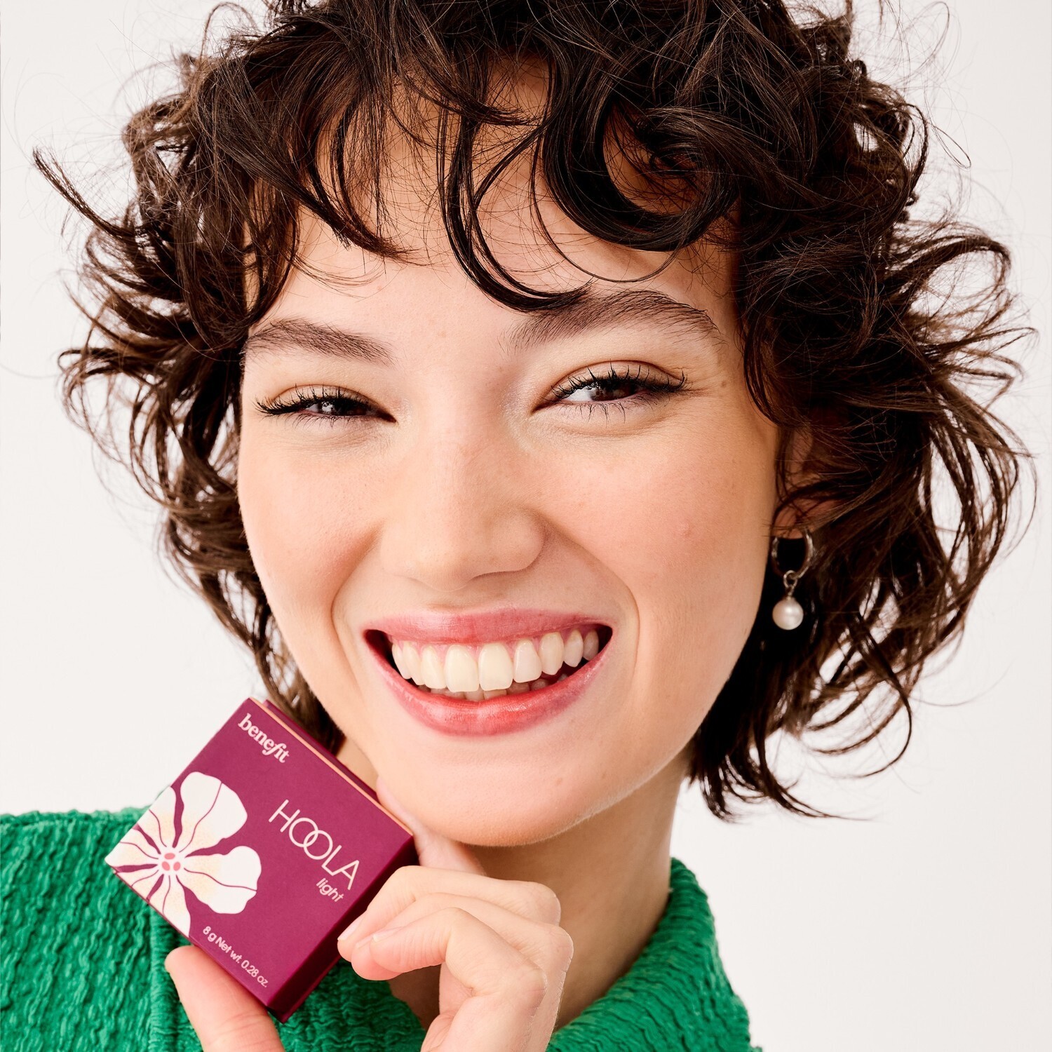 Нанесите матовый бронзер Hoola на щеки или на все лицо для придания бронзового, естественного вида Сияние.