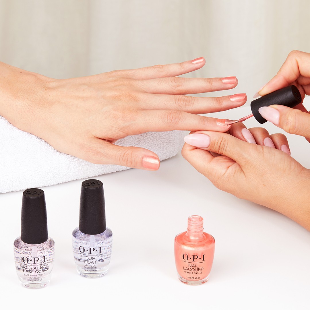 Шаг 1: Нанесите базовое покрытие OPI Natural Nail Base Coat. Оно улучшает адгезию и предотвращает изменение цвета.