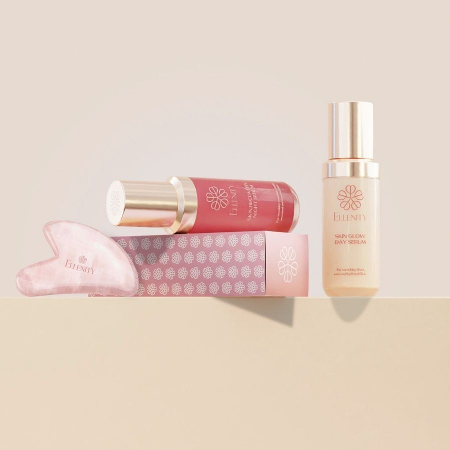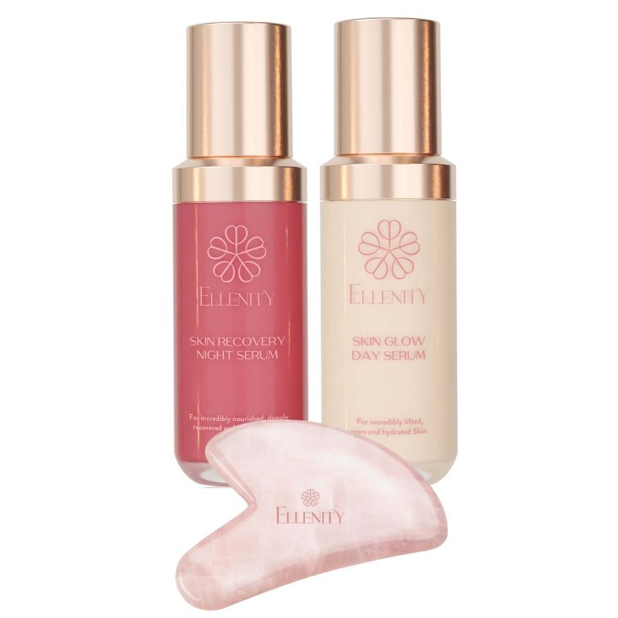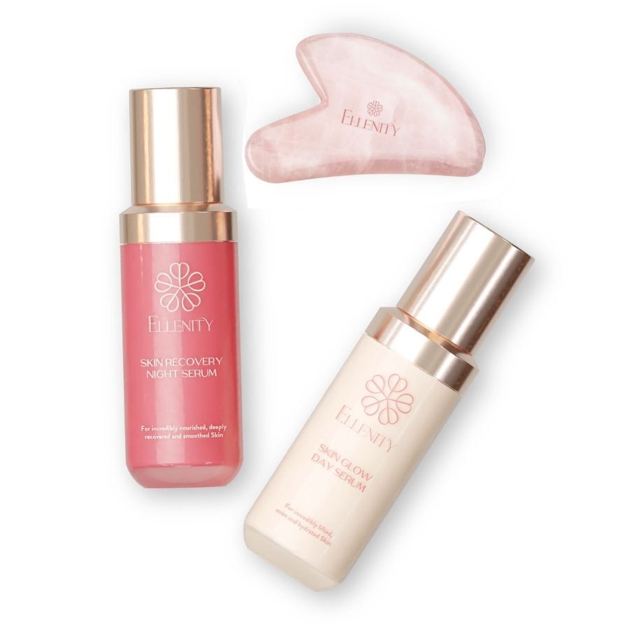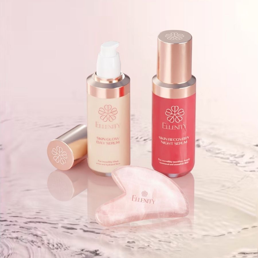 В зависимости от времени суток, нанесите подходящую сыворотку Ellenity's Skin Serum на очищенное лицо и, при необходимости, на шею и зону декольте. Начните с центра лица, держа вогнутую сторону Гуаша под небольшим углом. Мягко скользите по коже движениями от центра к краям. Продвигайтесь от шеи ко лбу.