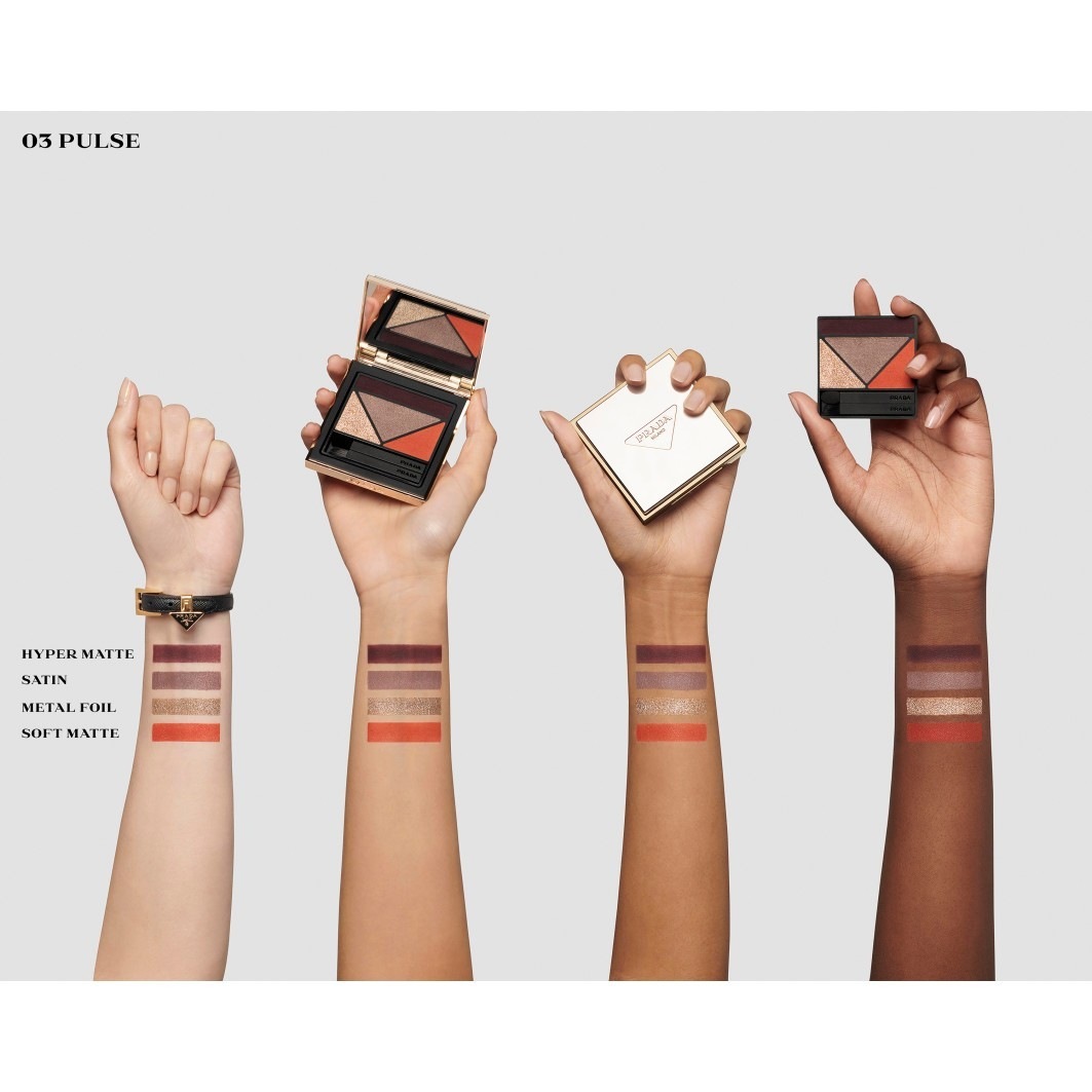 Четыре восхитительных сменных блока теней для век с двумя практичными мини-аппликаторами, обогащенными питательным маслом ореха инка, безупречным покрытием и высоким комфортом ношения до 12 часов, вдохновленными модными принтами из архива Prada.