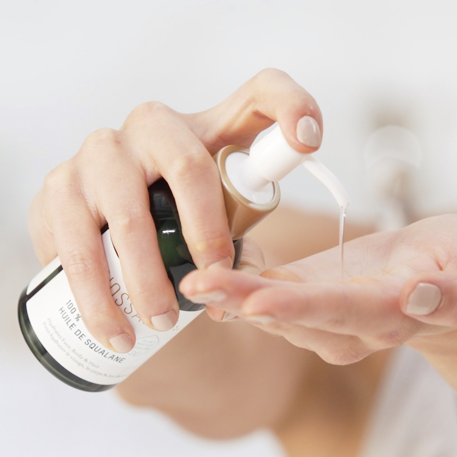 Сквалановое масло для лица: Разотрите небольшое количество чистого скваланового масла между ладонями, чтобы согреть его. Аккуратно похлопайте по лицу, шее и зоне декольте.