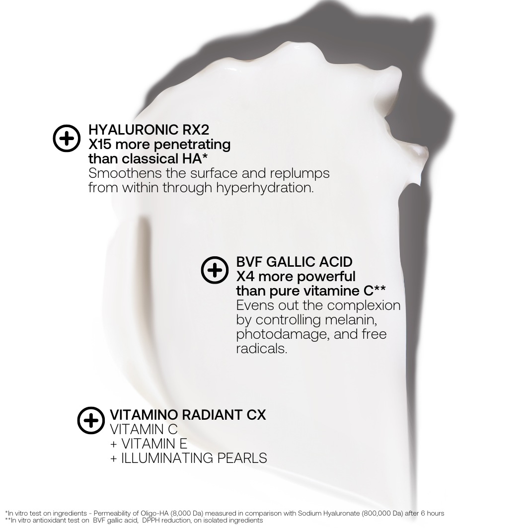 Состав: AQUA (ВОДА / EAU), C15-19 АЛКАН, КОКО-КАПРИЛАТ/КАПРАТ, ГЛИЦЕРИН, НИАЦИНАМИД, ЦЕТЕАРИЛОВЫЙ СПИРТ, ГИДРОГЕНИЗИРОВАННЫЕ РАСТИТЕЛЬНЫЕ ГЛИЦЕРИДЫ, ГЛЮКОНОЛАКТОН, ЦЕТЕАРИЛОВЫЙ ГЛЮКОЗИД, ЛАУРОИЛ ЛИЗИН, Полиакрилатный кроссполимер-6, бензоат натрия, стеароил глутамат натрия, аскорбилглюкозид, парфюмерная композиция (ароматизатор), гидроксид натрия, CI 77163 (оксихлорид висмута), масло семян подсолнечника (Helianthus annuus), токоферол, гиалуронат натрия, трет-бутиловый спирт, биосахаридная камедь-1, глюконат кальция, диглюкозилгалловая кислота, порошок перламутра, глицерилкаприлат.