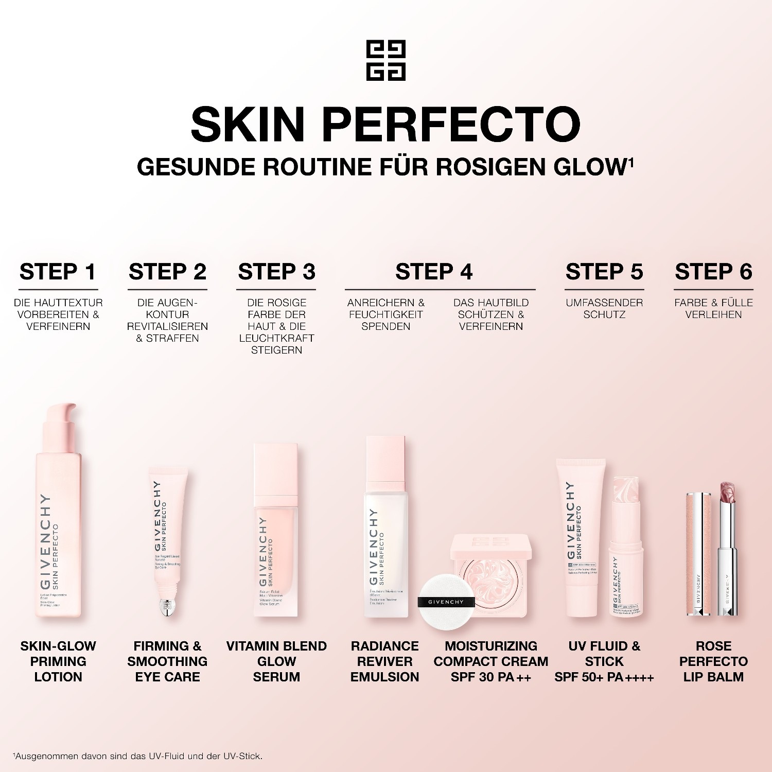 Наносите компактный крем Skin Perfecto вместо обычного крема для лица или после сыворотки Skin Perfecto Vitamin Blend Glow, чтобы увлажнить и осветлить кожу.