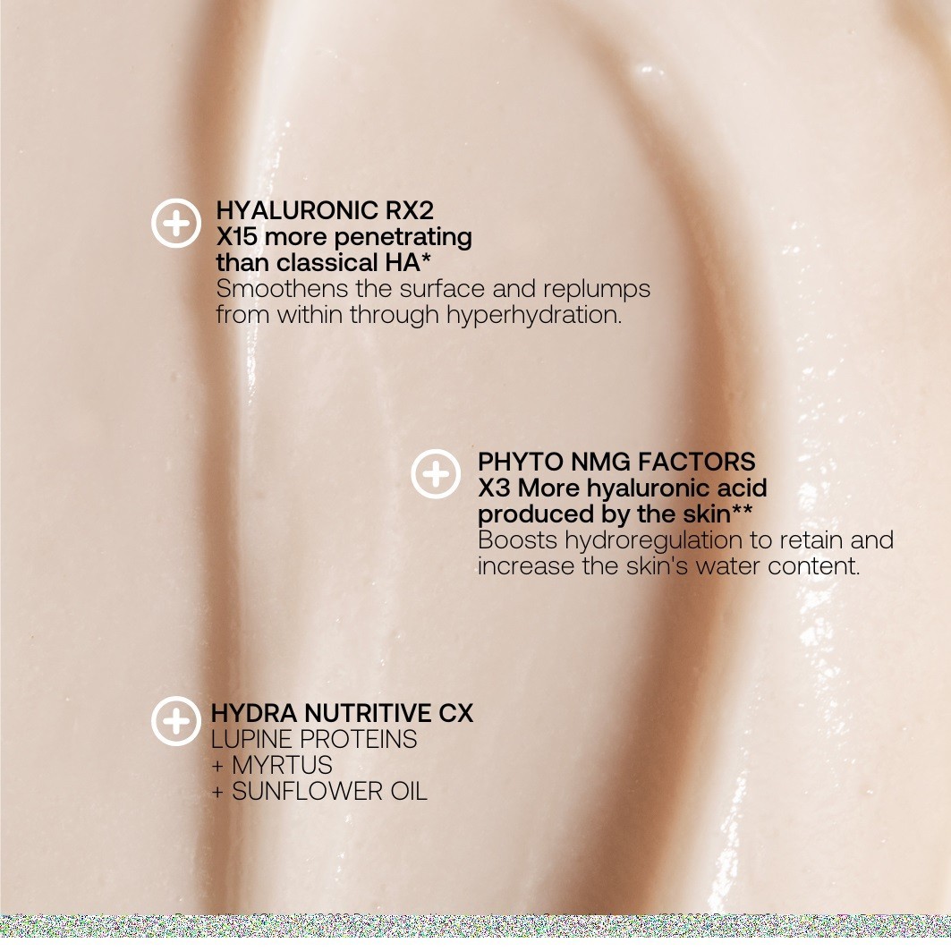 Состав: вода (Aqua / Eau), диметикон, глицерин, полисиликон-11, масло семян подсолнечника (Helianthus Annuus), бегениловый спирт, ПЭГ-10 диметикон, пропилгептил каприлат, пентилен Гликоль, цетеариловый спирт, изононилизононаноат, феноксиэтанол, глицерилстеарат, гидрогенизированный лецитин, стеарат ПЭГ-100, аммония акрилоилдиметилтаурат/бегенет-25 метакрилат кроссполимер, цетеарилглюкозид, натрия пирролидонкарбонат, каприлилгликоль, циклодекстрин, гидролизованный белок люпина, парфюмерная композиция (ароматизатор), гиалуронат натрия, лактат натрия, экстракт клеток листьев адениума тучного, бутилгидрокситолуол (BHT), ксантановая камедь, дивинилдиметикон/диметикон кроссполимер, пропандиол, динатрий ЭДТА, O-цимен-5-ол, тетрагидроксипропилэтилендиамин, аденозин, экстракт листьев мирта обыкновенного, бутиленгликоль, глюкоза, гиалуроновая кислота, фенэтиловый спирт, Диоксид титана, каррагинан натрия, экстракт корня вяза Давидова, бензоат натрия, этилгексилглицерин, экстракт шалфея мускатного (Salvia Sclarea), экстракт клеточной культуры плодов яблони домашней (Malus Domestica), морская соль (Sel marin), сорбат калия, лимонная кислота, лецитин, хлорид натрия, сульфат натрия, CI 16035 (красный 40), CI 42090 (синий 1).