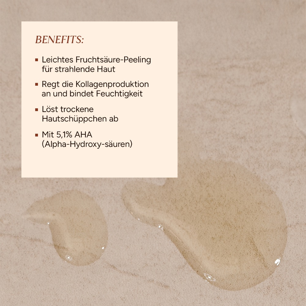 Мягкий пилинг с фруктовыми кислотами для сияющей кожи, стимулирует выработку коллагена и связывает влагу, удаляет сухие чешуйки кожи, содержит 5,1% AHA (альфа-гидроксикислот).