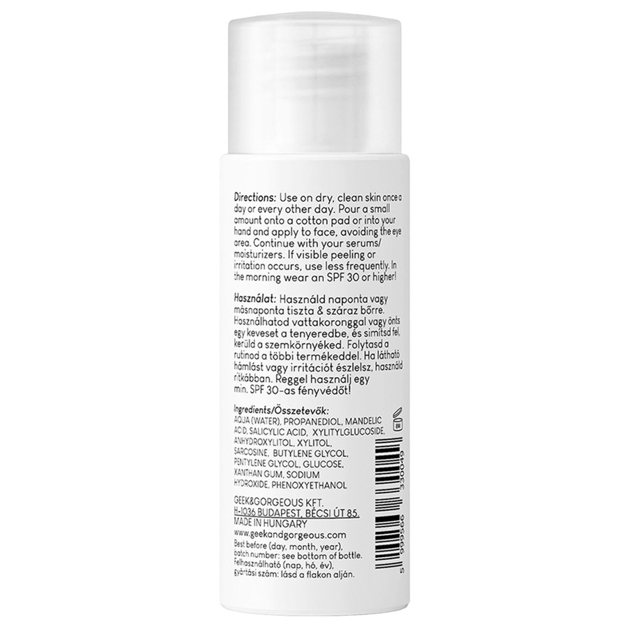 Состав: вода (Aqua), пропандиол, миндальная кислота, салициловая кислота, ксилитилглюкозид, ангидроксилит, ксилит, саркозин, бутиленгликоль, пентиленгликоль, глюкоза, ксантановая камедь, гидроксид натрия, феноксиэтанол.