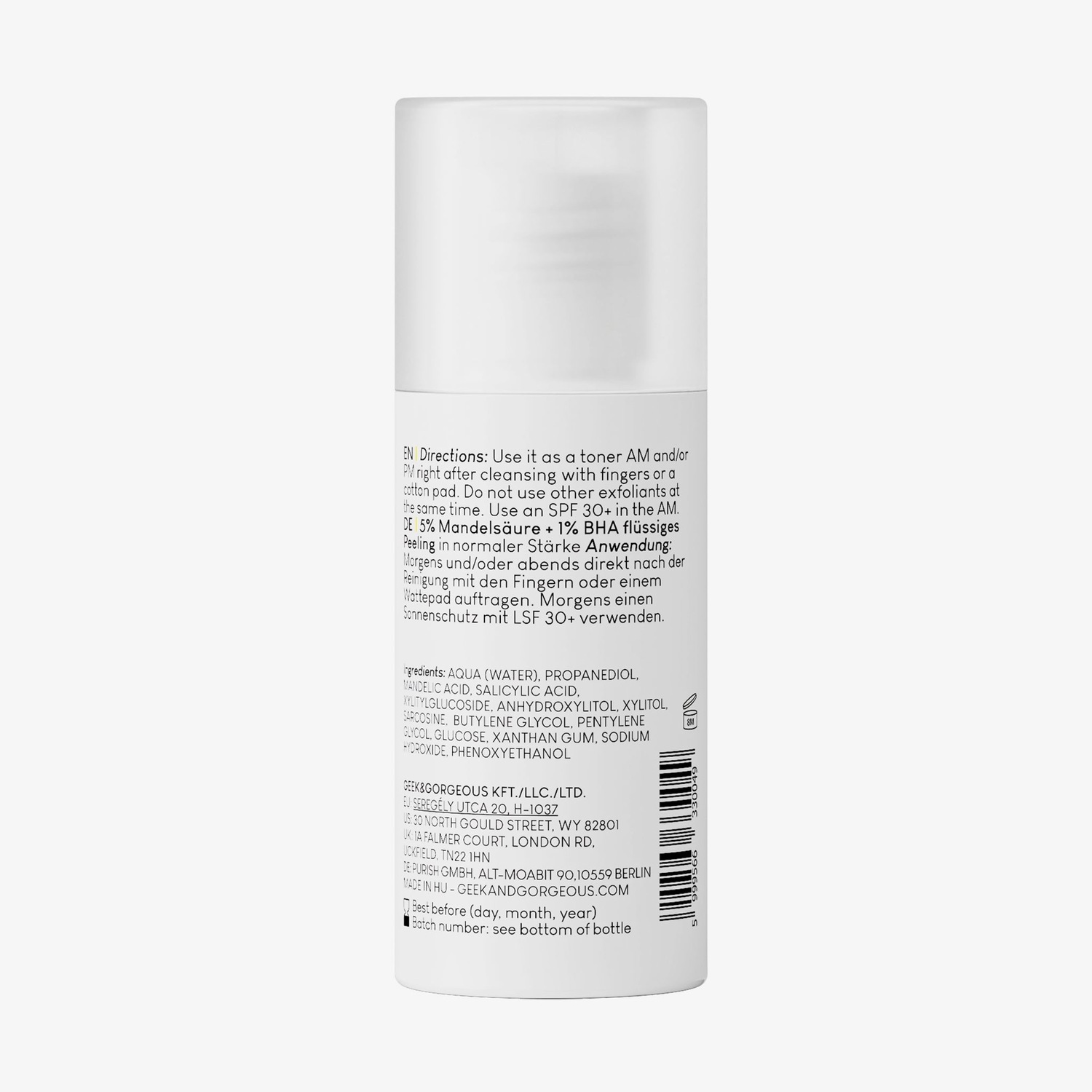 Состав: вода (Aqua), пропандиол, миндальная кислота, салициловая кислота, ксилитилглюкозид, ангидроксилит, ксилит, саркозин, бутиленгликоль, пентиленгликоль, глюкоза, ксантановая камедь, гидроксид натрия, феноксиэтанол.