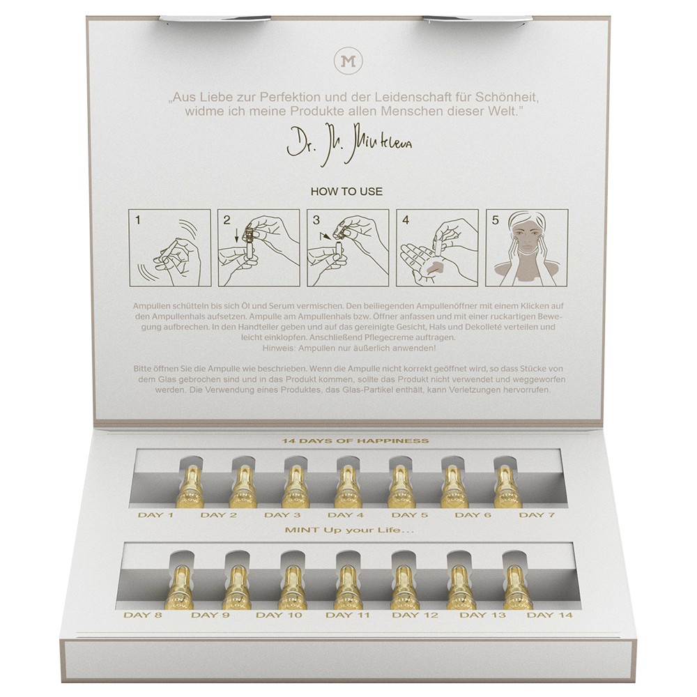 Встряхните ампулы, пока масло и сыворотка не смешаются. Нажмите на прилагаемую открывалку ампул на горлышко ампулы. Возьмите ампулу за горлышко или открывалку и откройте ее быстрым резким движением. Вылейте содержимое на ладонь и нанесите на очищенное лицо, шею и зону декольте, аккуратно похлопывая. Затем нанесите увлажняющий крем. Примечание: Ампулы предназначены только для наружного применения! Внимание: Пожалуйста, открывайте ампулу, как описано на внутренней стороне коробки. Если ампула открыта неправильно, и в продукт попадут стеклянные частицы, продукт не следует использовать и его следует выбросить. Использование продукта, содержащего стеклянные частицы, может привести к травмам. Состав: сок листьев алоэ вера (Aloe Barbadensis), масло семян подсолнечника (Helianthus Annuus), масло сладкого миндаля (Prunus Amygdalus Dulicis), сквалан, масло семян крамбе абиссинской (Crambe Abissinica), токоферилацетат, мальтодекстрин, масло плодов шиповника (Rosa Canina), глицерин, экстракт сверции (Swertia Chirata), экстракт семян киноа (Chenopodium Quinoa), экстракт корня моркови (Daucus Carota Sativa), экстракт семян сои (Glycine Max), экстракт риса (Oryza Sativa), экстракт корня женьшеня (Panax Ginseng), экстракт планктона, листья розмарина лекарственного (Rosmarinus Officinalis) ЭКСТРАКТ, ГИАЛУРОНАТ НАТРИЯ, ЭКСТРАКТ ПЛОДОВ ГРАНАТА, БЕТА-КАРОТИН, ЭТИЛГЕКСИЛГЛИЦЕРИН, ДИНАТРИЙ ЭДТА, ФЕНОКСИЭТАНОЛ, ГЕРАНИОЛ, ЦИТРОНЕЛЛОЛ