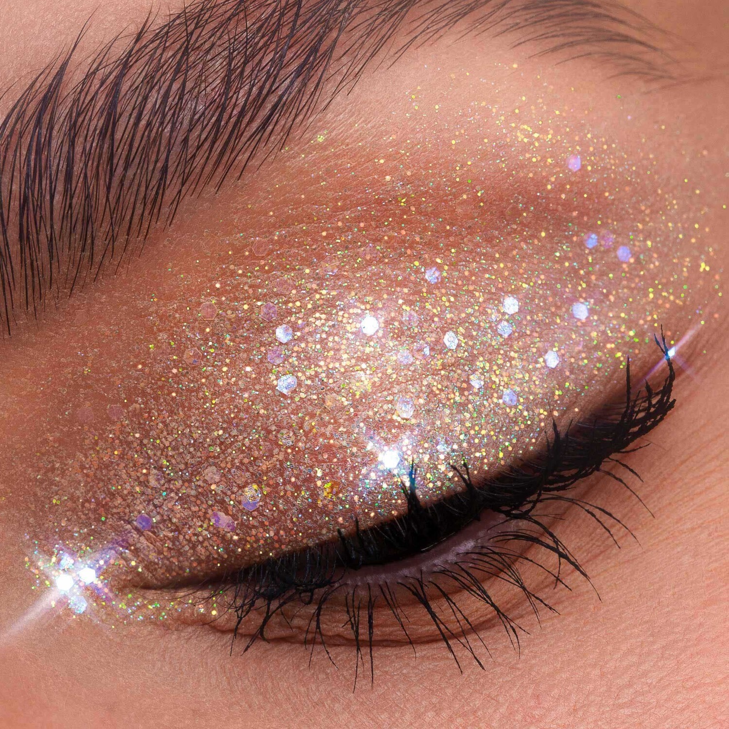 Нанесите блестки на нужную область кончиками пальцев или плоской щетинной кистью. Продукту не требуется праймер или клей для сцепления с кожей!