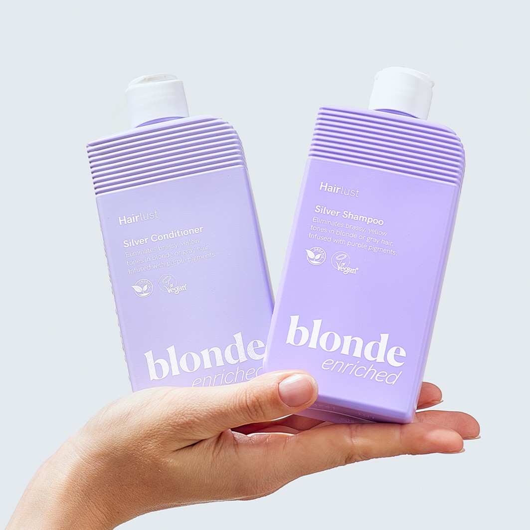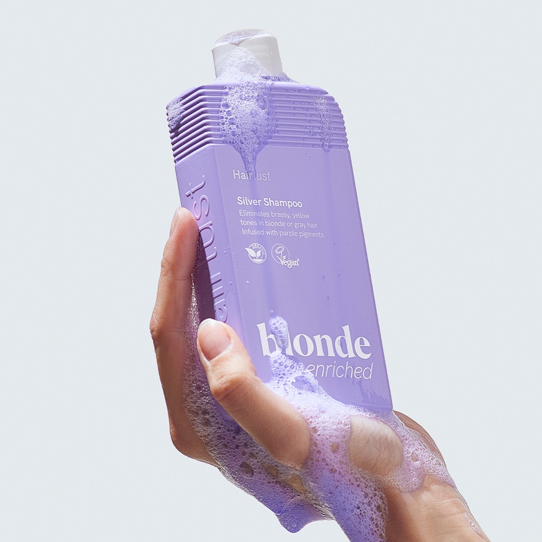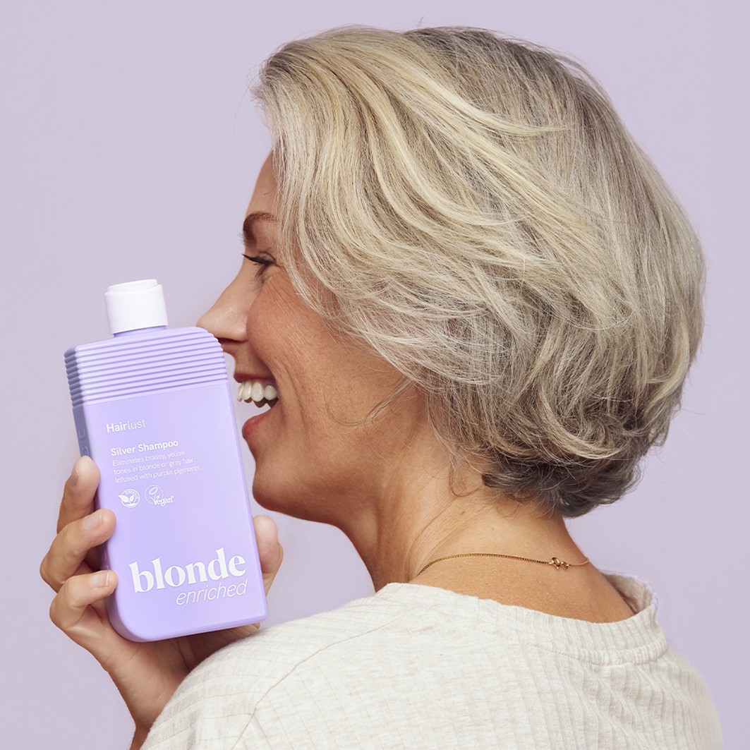 Вымойте волосы серебристым шампунем в два этапа: сначала равномерно распределите фиолетовый шампунь по влажным волосам, тщательно помассируйте кожу головы и смойте. Затем вспеньте фиолетовый шампунь и распределите его по всей длине. Оставьте средство на 1-2 минуты в зависимости от потребностей ваших волос. Затем ополосните волосы и завершите уход кондиционером Enriched Blonde Silver.