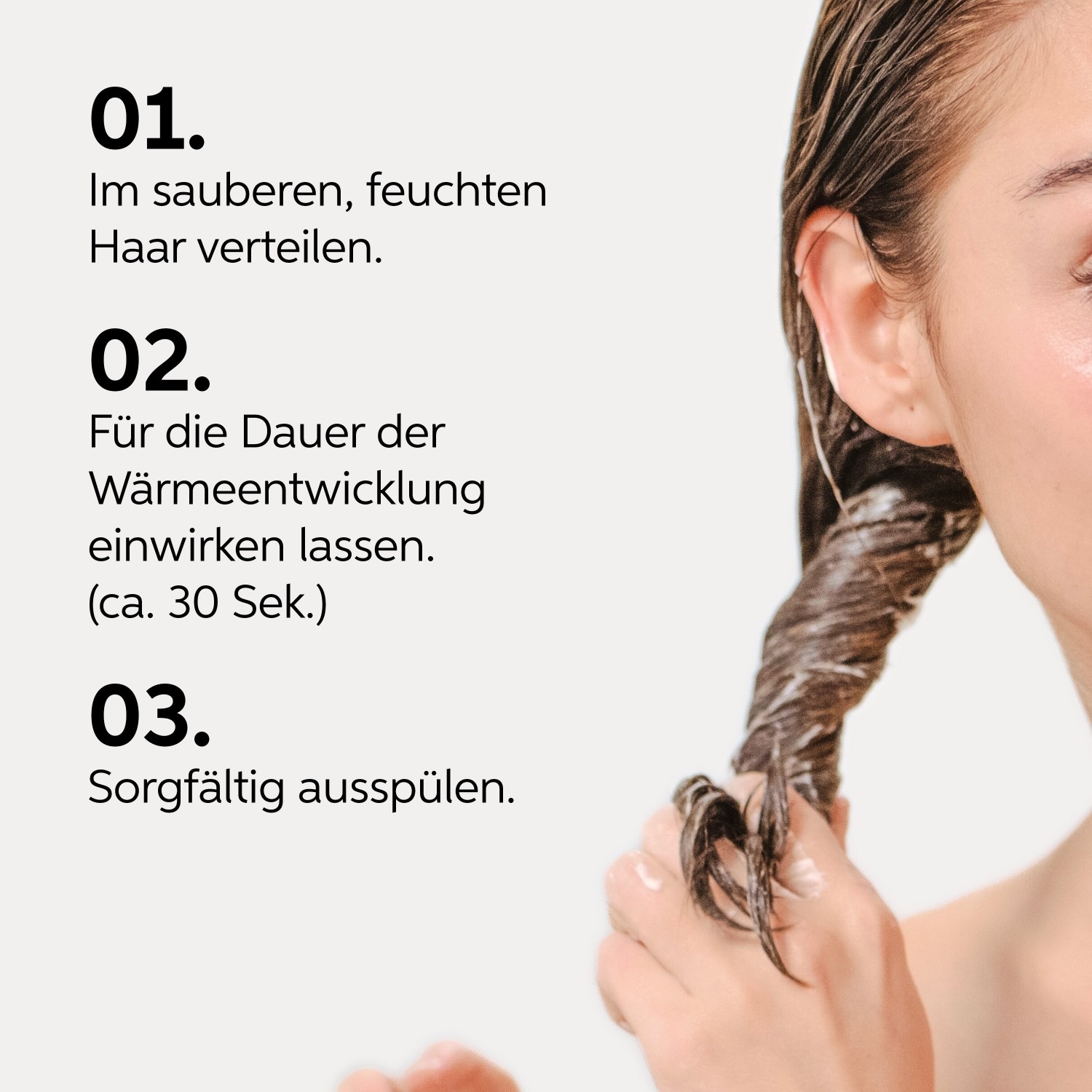 Нанесите на влажные волосы массирующими движениями и равномерно распределите. Оставьте на время согревающего эффекта (примерно на 30 секунд), затем тщательно смойте. Состав: ПЭГ-4, ППГ-34, сульфат магния, диметикон, стеариловый спирт, диолеоилэтилгидроксиэтилмония метосульфат, сополимер ПЭГ/ППГ-300/55, цетиловый спирт, хлорид бегентримония, парфюмерная композиция, пантенол, гидроксипропилцеллюлоза, хлорид цетримония, изопропиловый спирт, метилпарабен, вода, гексиленгликоль, денатурированный спирт, токоферилацетат, масло косточек абрикоса, масло сладкого миндаля, пропилпарабен, линалоол, гексилциннамаль, бензилсалицилат, цитронеллол, бутилгидрокситолуол, гераниол.
