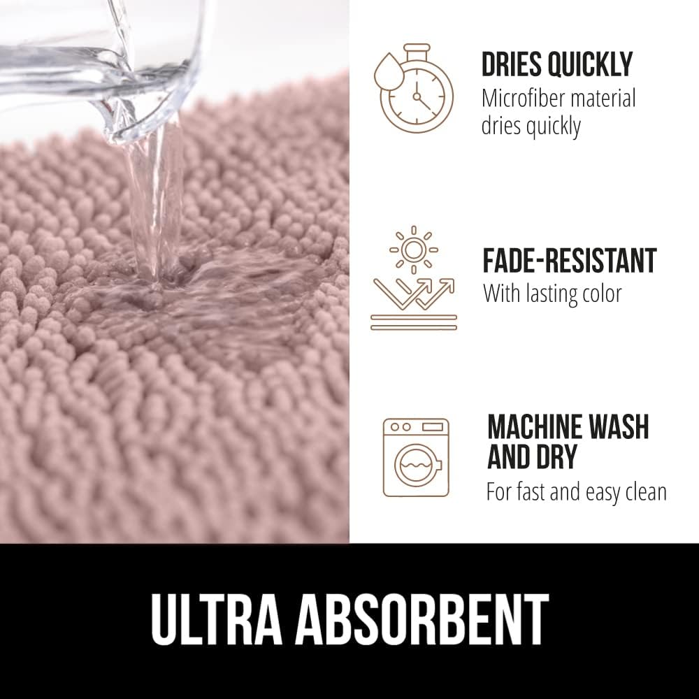Коврик для ванной Gorilla Grip имеет впитывающий верхний слой из шенилла, который быстро удаляет влагу с ног. Его плотная резиновая подложка надёжно фиксирует коврик на полу, предотвращая скольжение. Благодаря быстросохнущим материалам, он остаётся гигиеничным и препятствует образованию плесени. Продукт идеально сочетает безопасность, удобство и практичность для ежедневного использования.