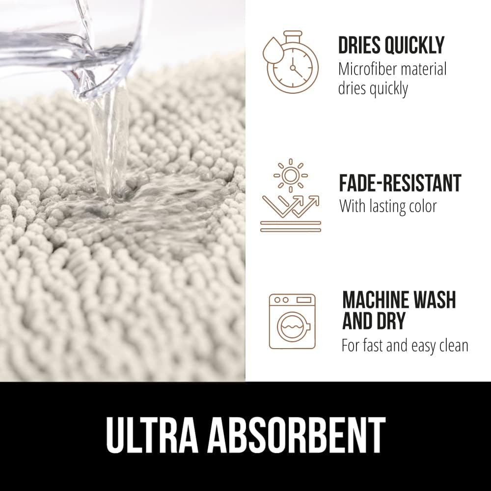 Коврик для ванной Gorilla Grip имеет впитывающий верхний слой из шенилла, который быстро удаляет влагу с ног. Его плотная резиновая подложка надёжно фиксирует коврик на полу, предотвращая скольжение. Благодаря быстросохнущим материалам, он остаётся гигиеничным и препятствует образованию плесени. Продукт идеально сочетает безопасность, удобство и практичность для ежедневного использования.