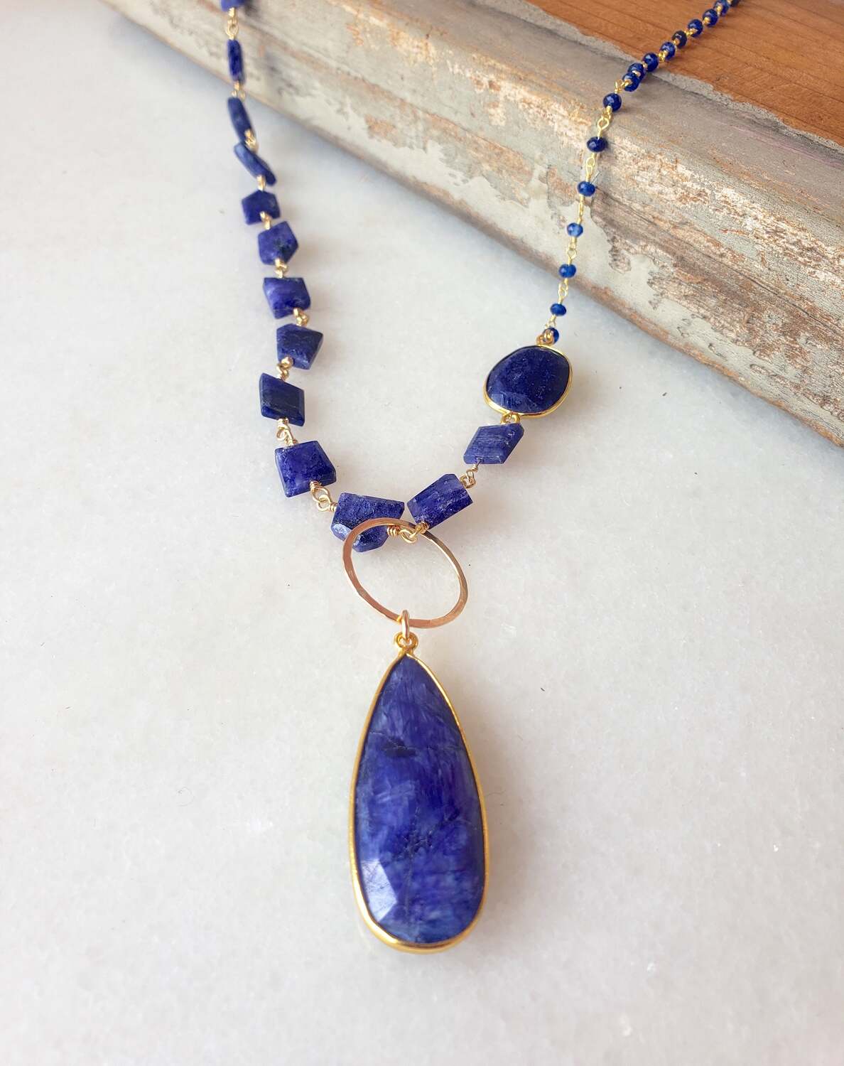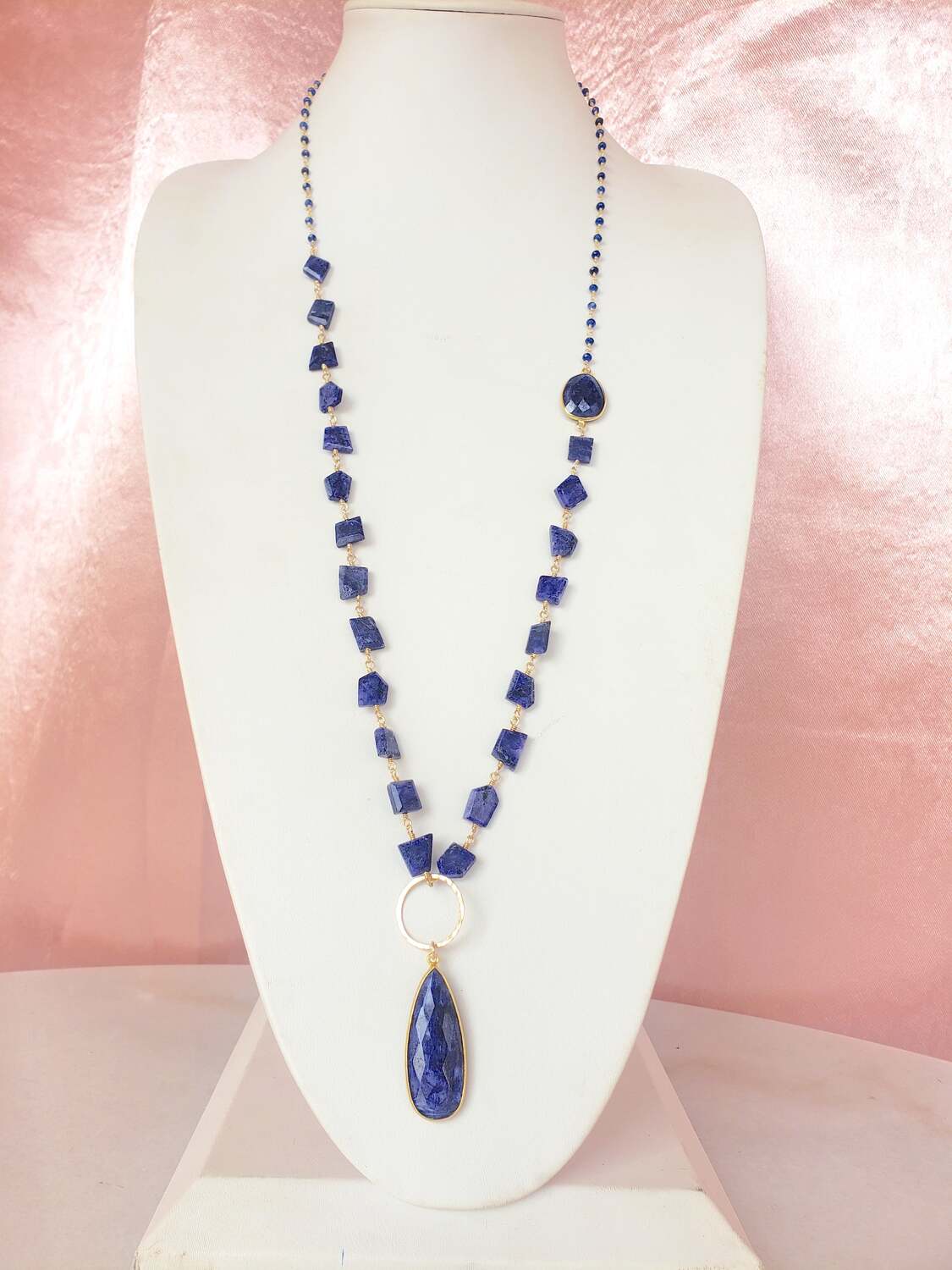 Универсальное длинное ожерелье с сапфиром. Его можно носить как многослойное, как лариат или использовать толстую или простую цепочку в качестве центрального элемента.