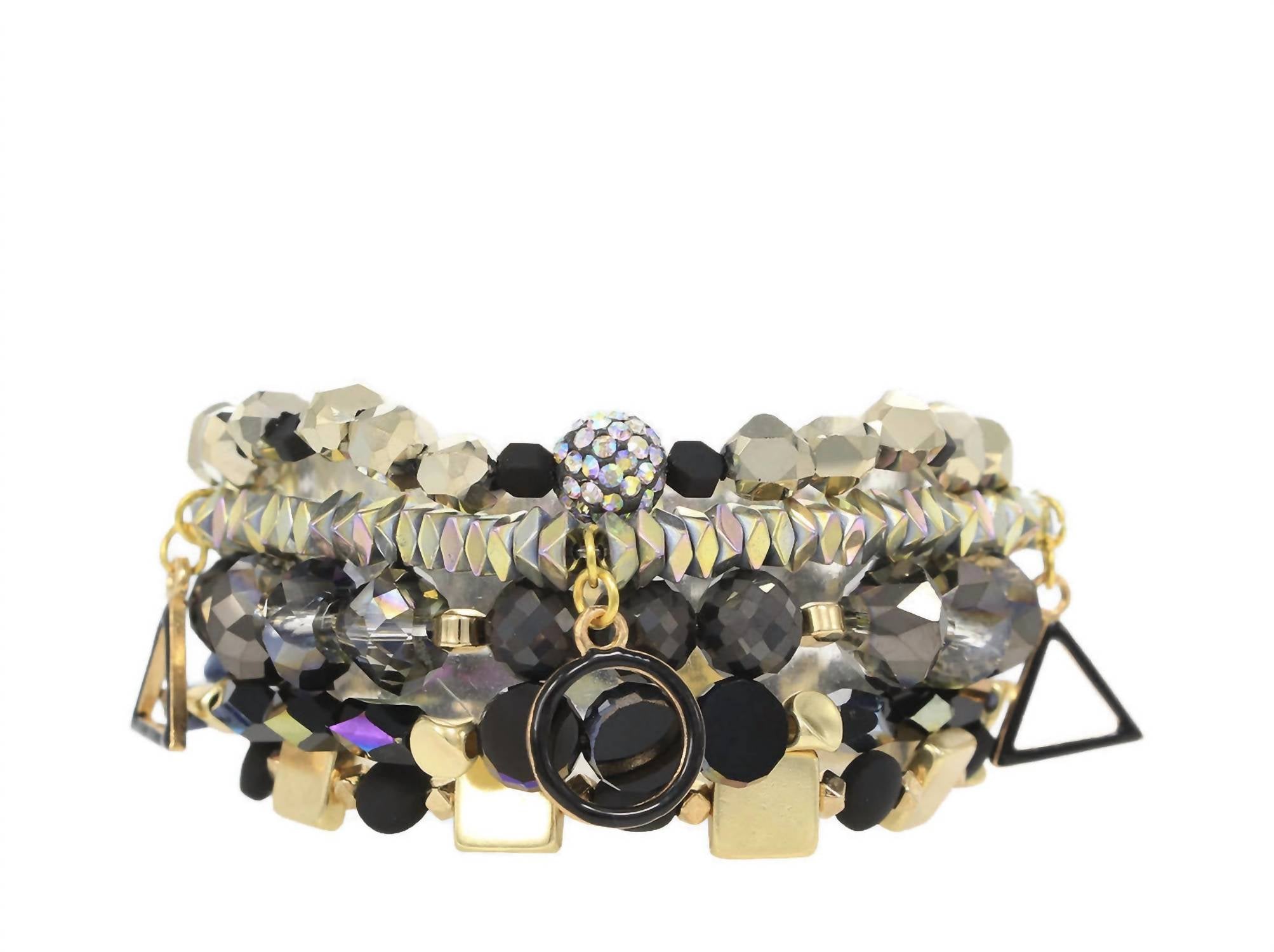 Этот эффектный браслет можно носить как самостоятельно, так и в сочетании с любимыми украшениями. Представляем набор женских браслетов Erimish Onyx - потрясающую коллекцию в цвете Black Multi, сочетающую в себе игривое сочетание черных и золотых бусин, украшенных черными круглыми и треугольными подвесками. Этот набор из пяти эластичных браслетов, изготовленных полностью из синтетических камней и покрытых золотом, можно носить по отдельности или вместе, создавая индивидуальный образ. Каждое изделие изготовлено вручную без использования свинца и никеля, демонстрируя креативное сочетание драгоценных камней для создания доступного и модного образа. Поскольку каждый браслет уникален, вариации цвета, формы и размера бусин придают им неповторимое очарование.