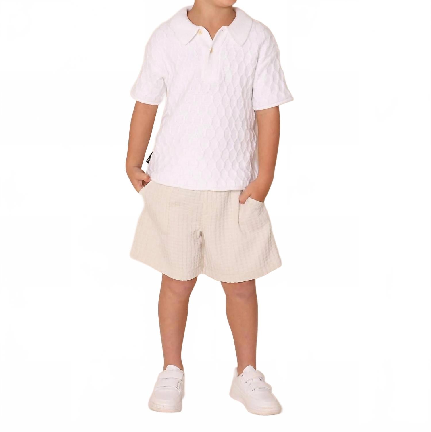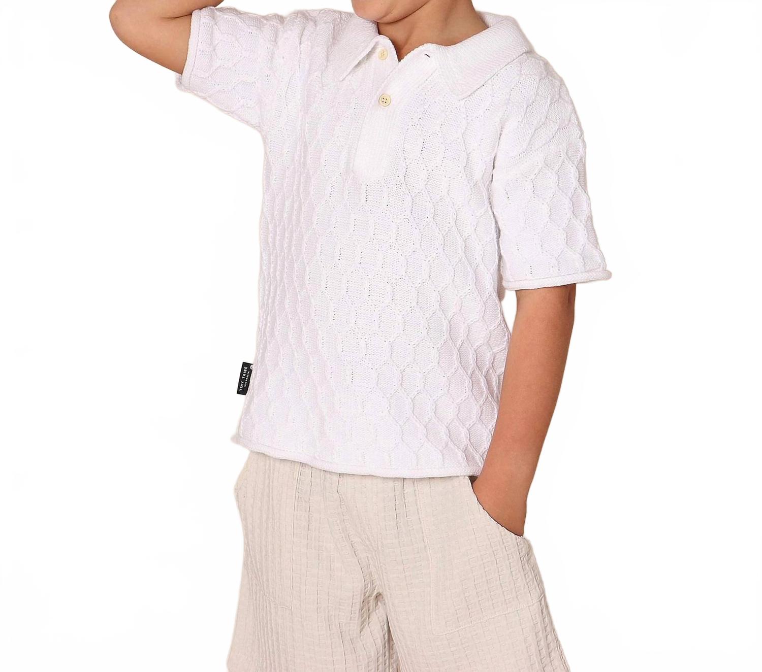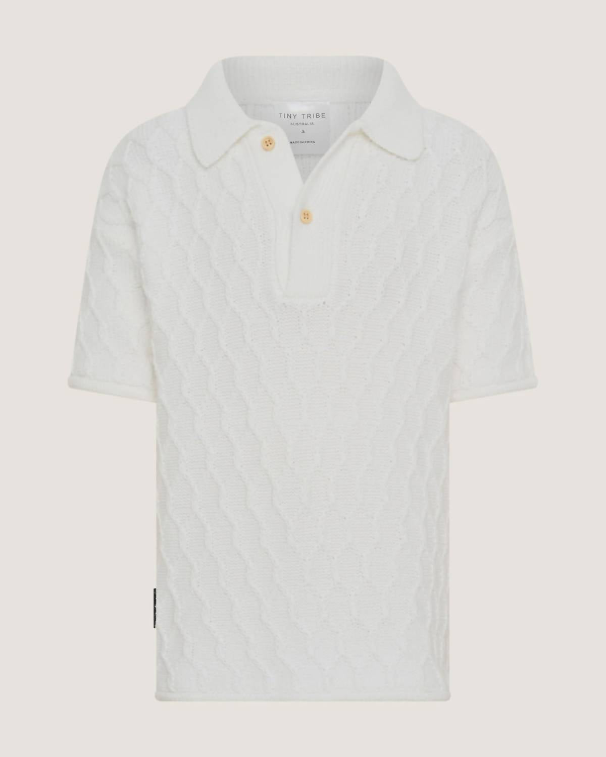 Подчеркните стиль вашего малыша с помощью вязаного крючком топа-поло от TINY TRIBE, который добавит нотку элегантности любому наряду. Этот топ для мальчиков с короткими рукавами, фактурным узором и стильным подвернутым краем выполнен полностью из мягкого хлопка. Белое поло с воротником-стойкой и застежкой на две пуговицы придает ему безупречный вид. Уход за изделием очень прост: его можно стирать в стиральной машине в деликатном режиме, а сушить на веревке - для долговечности.