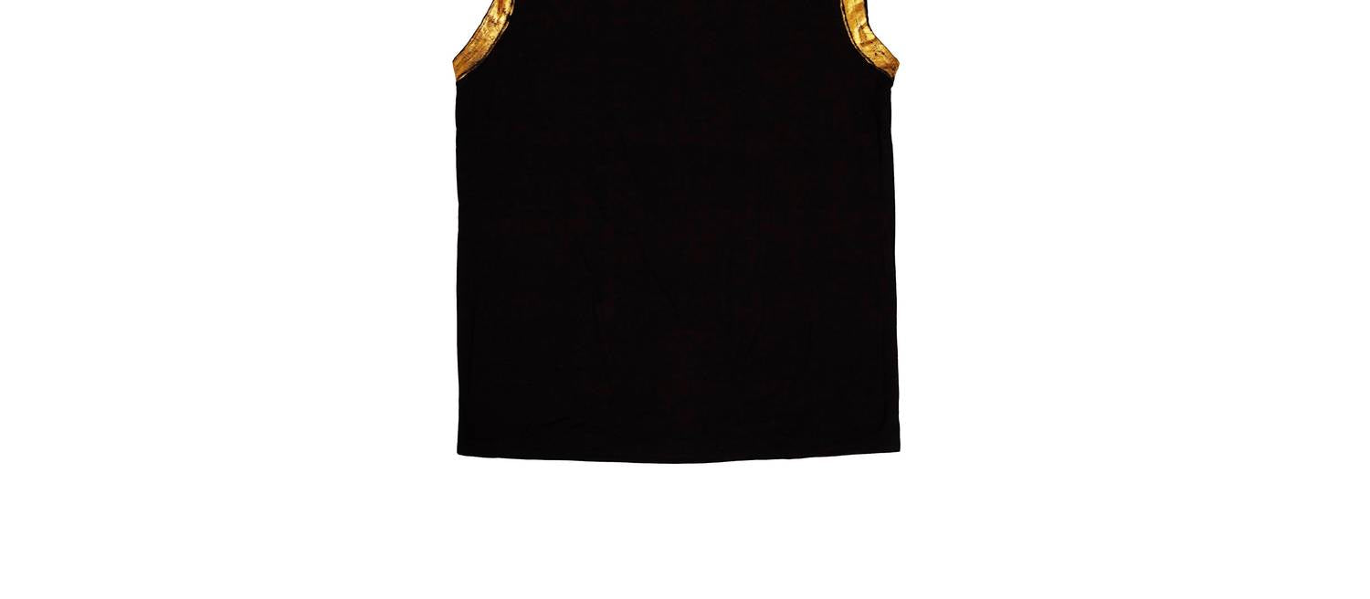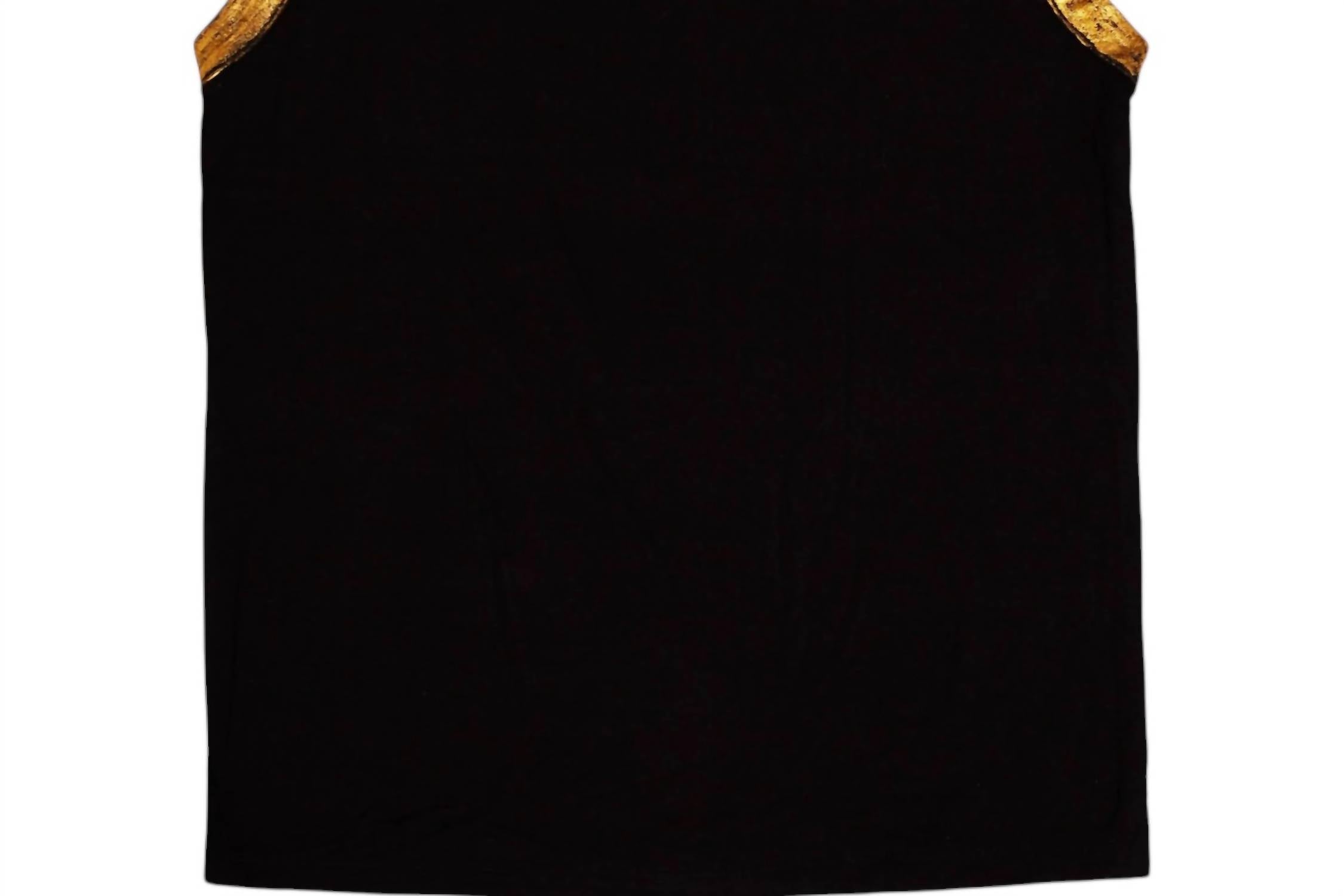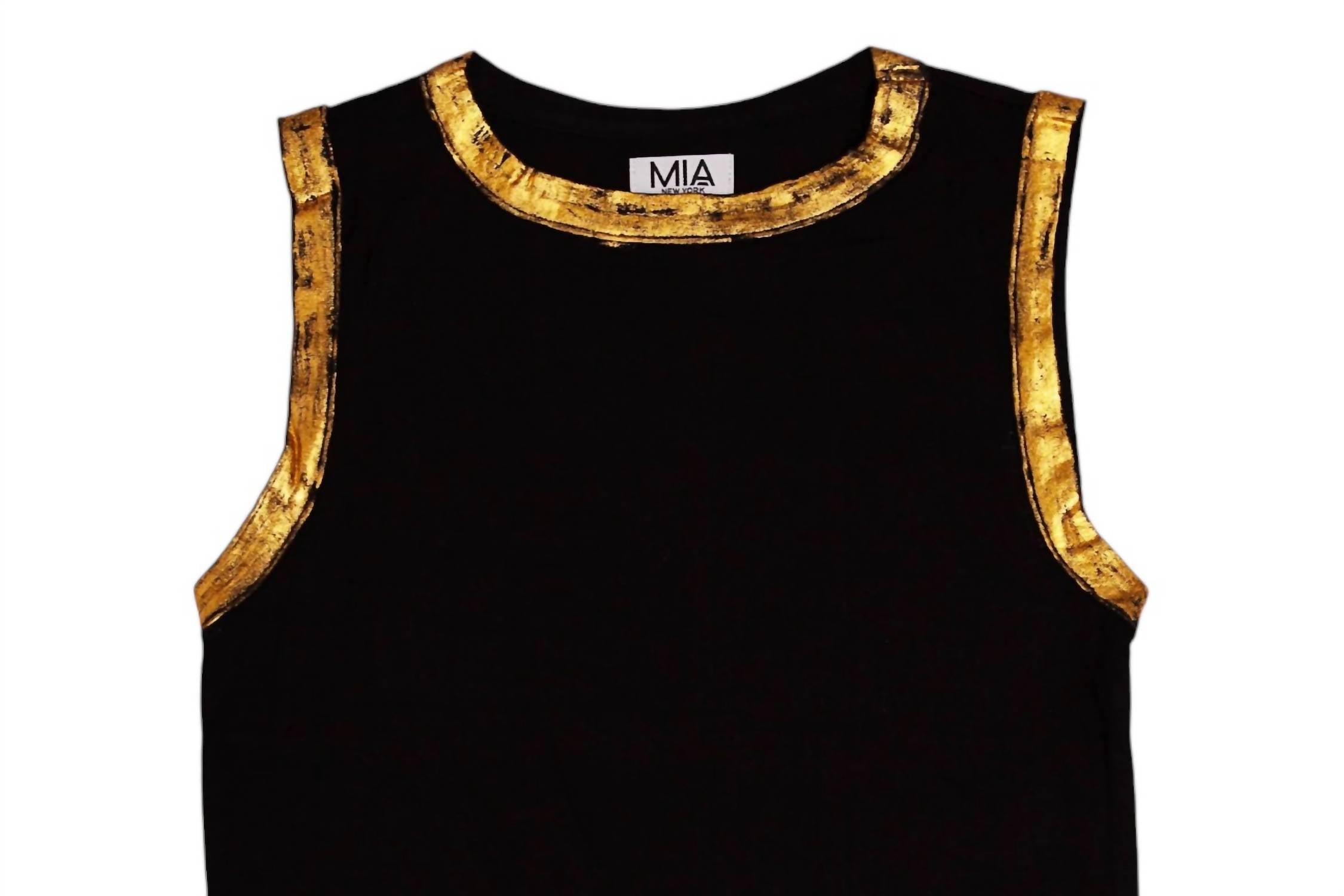 Представляем майку-топ с фольгой для девочек от MIA - шикарное дополнение к вашему летнему гардеробу. Эта стильная майка классического черного цвета украшена серебристыми и золотыми акцентами, имитирующими фольгу, вдоль горловины и рукавов, что добавит нотку гламура любому образу для отпуска. Состав этой роскошной модели: 95% вискозы и 5% спандекса, она сочетает в себе комфорт и стиль. Уход прост: ручная стирка и сушка на веревке. Доступен в размере XXS/14 для девочек.
