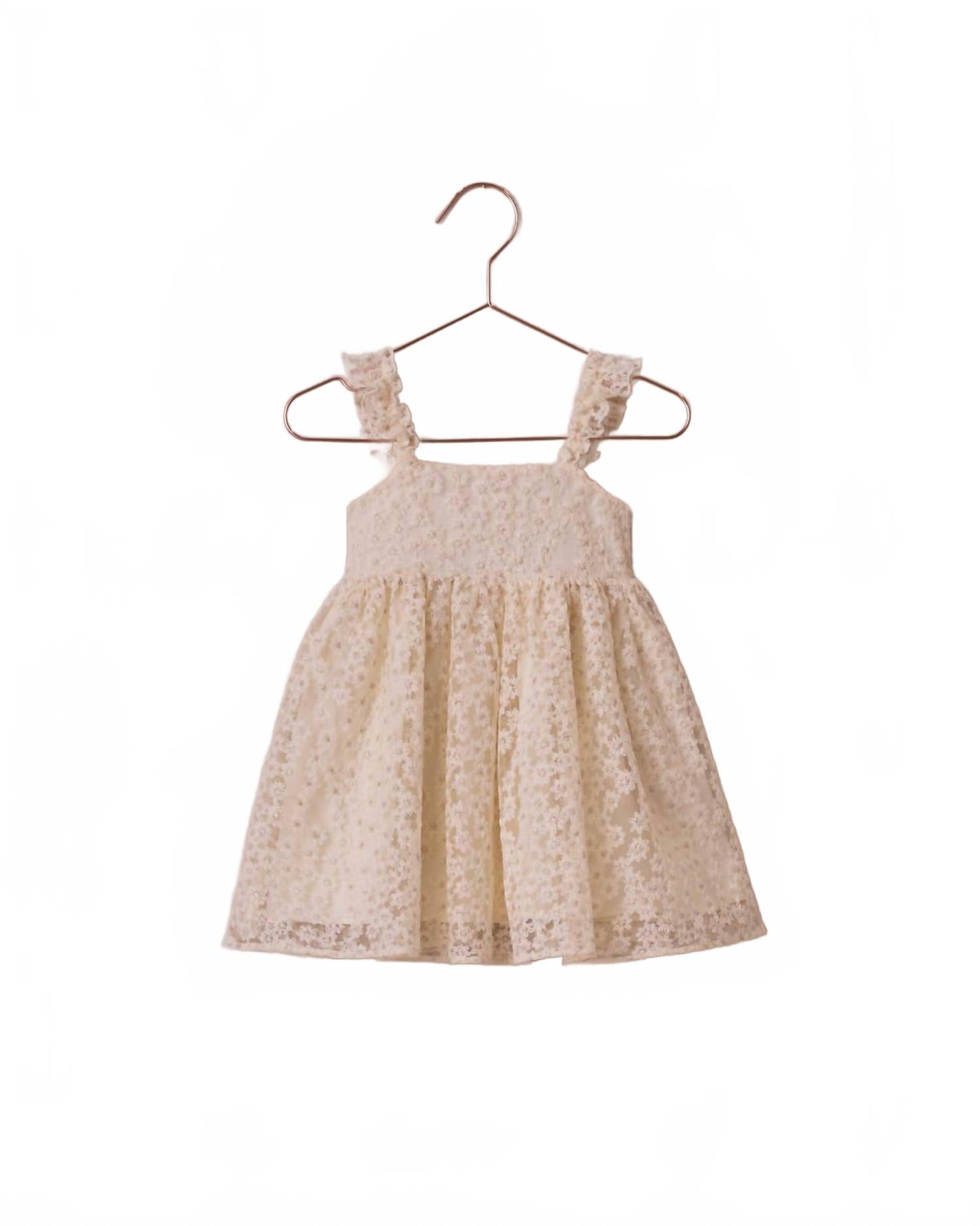 Встречайте великолепное платье Mara от Noralee - идеальное сочетание элегантности и комфорта для особых случаев вашей малышки. Платье с очаровательными эластичными бретельками с оборками и присборенным сзади лифом украшено вышивкой в ​​виде ромашек на мягком тюле цвета слоновой кости. Платье изготовлено из полиэстера и подложено из вискозы. Уход за ним очень прост: стирать в стиральной машине в холодной воде и сушить на веревке. В комплект входят панталончики для размеров 12M - 2Y, что делает это платье в винтажном стиле идеальным для весны и праздников.