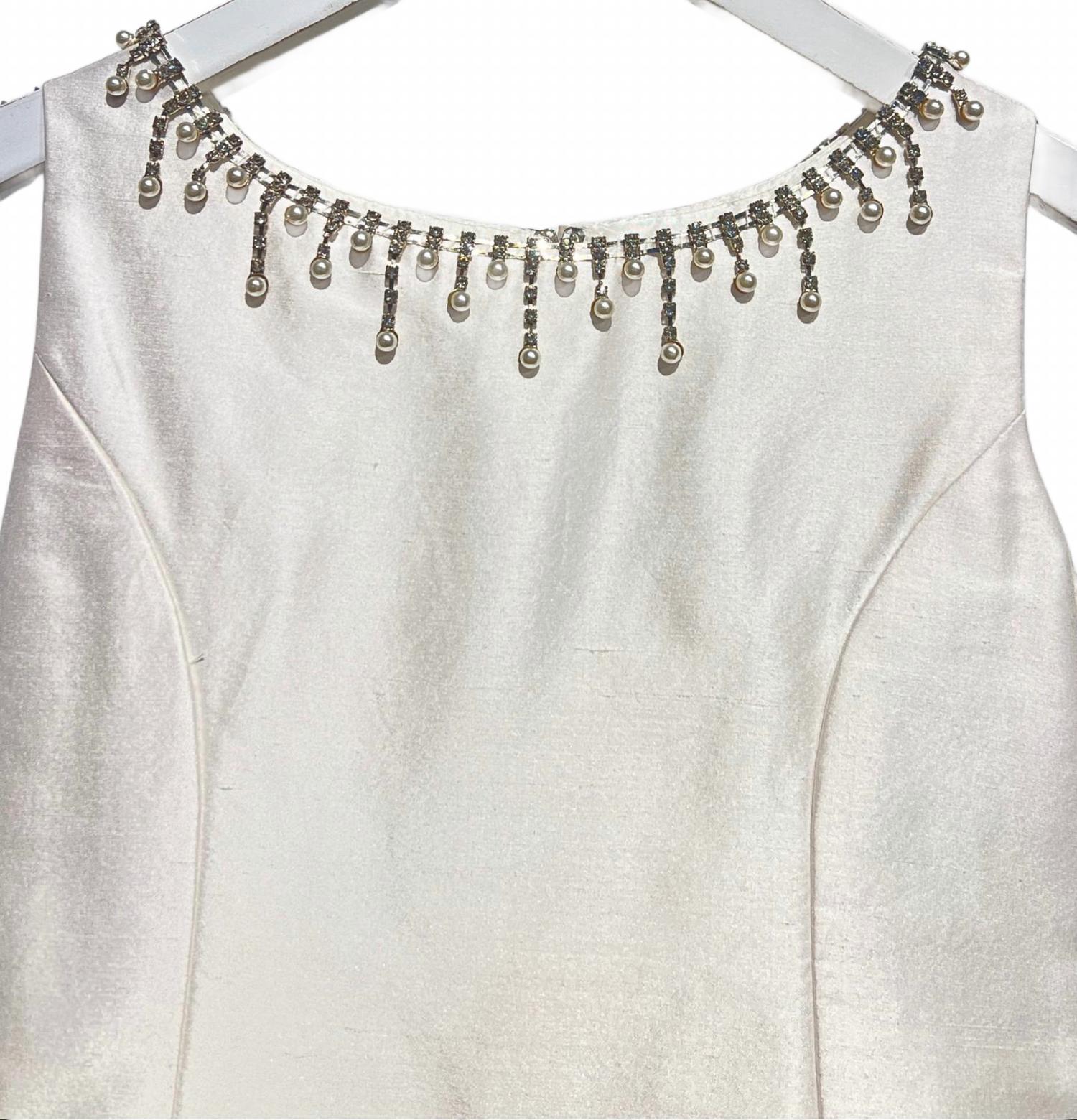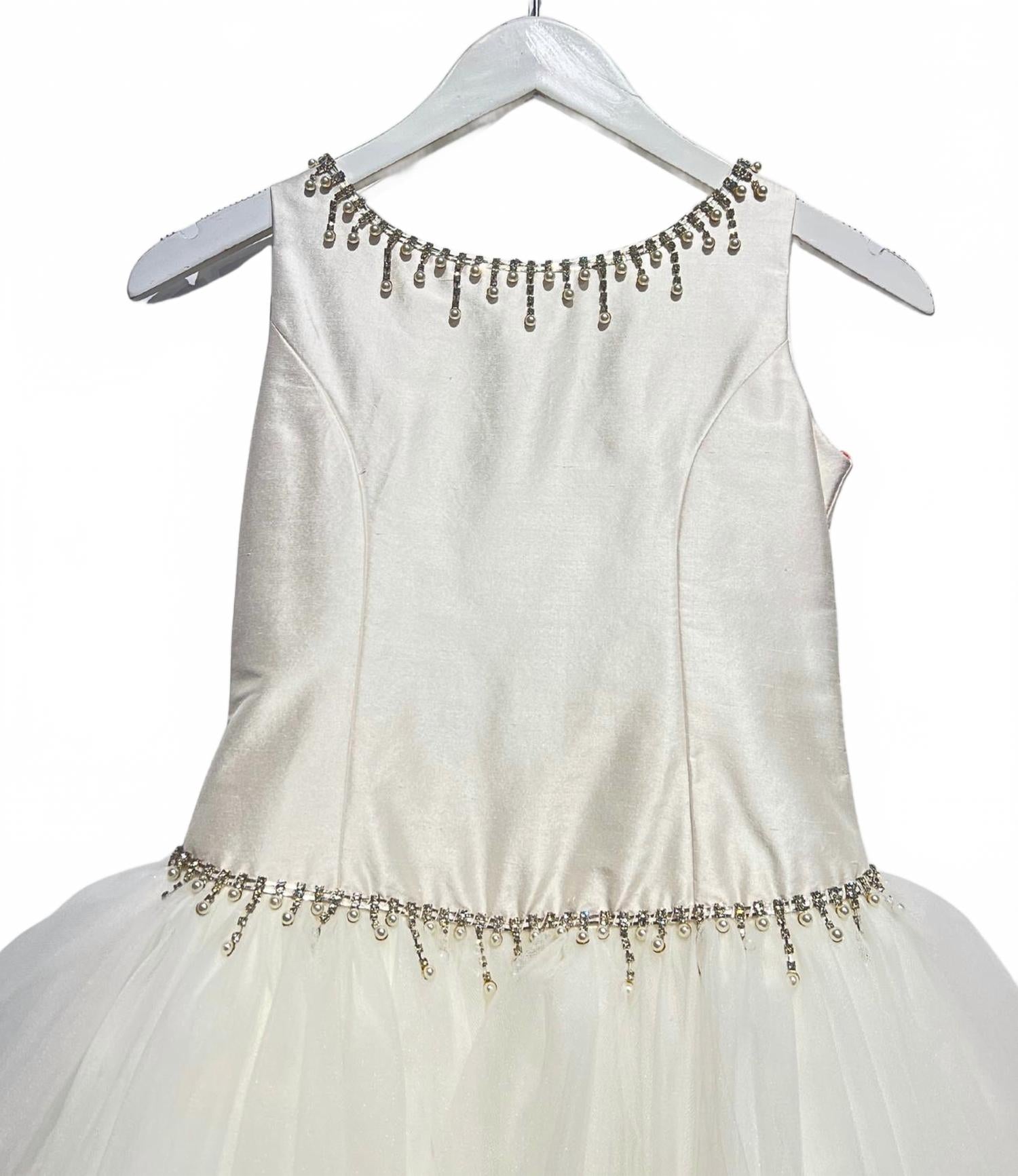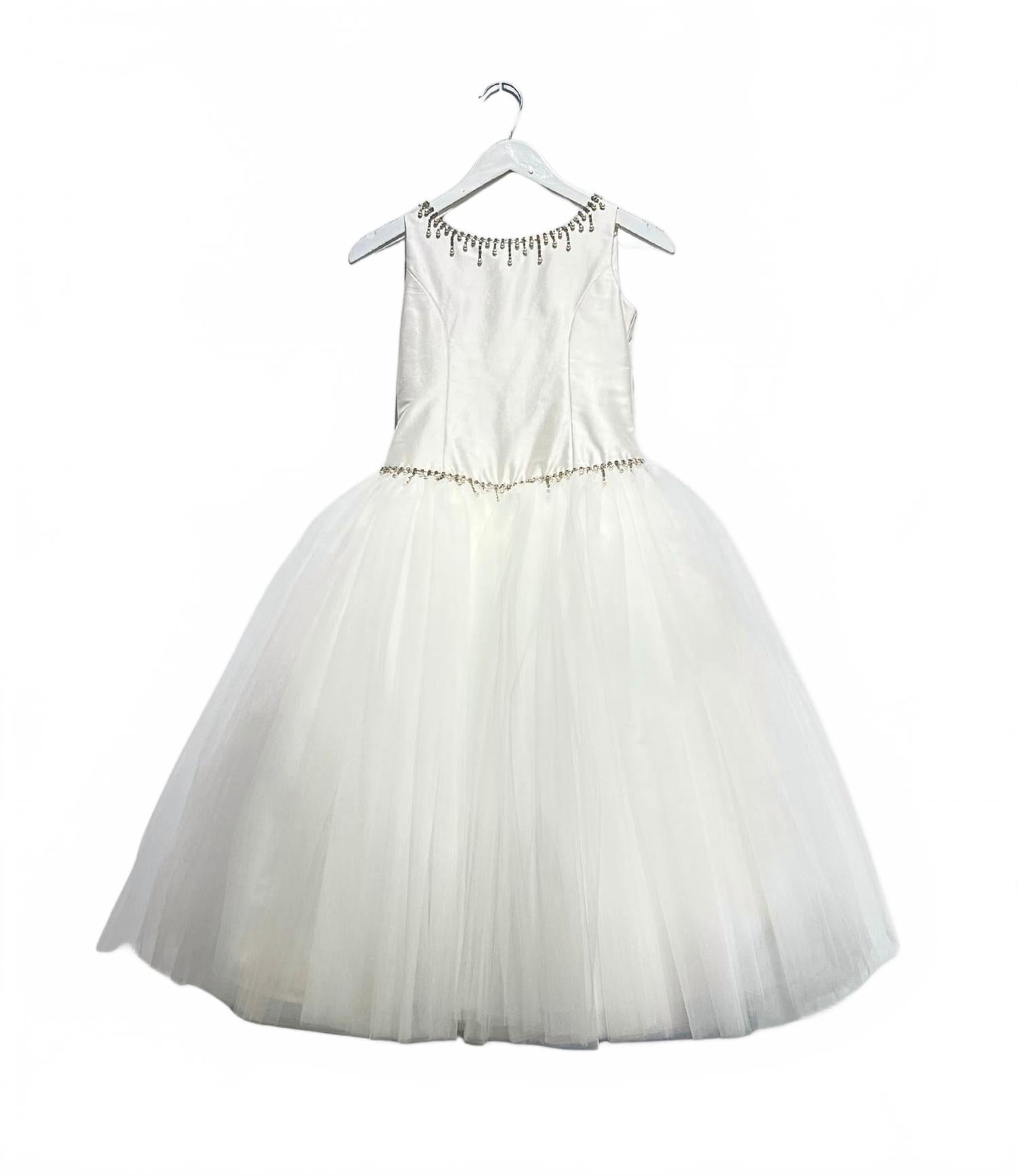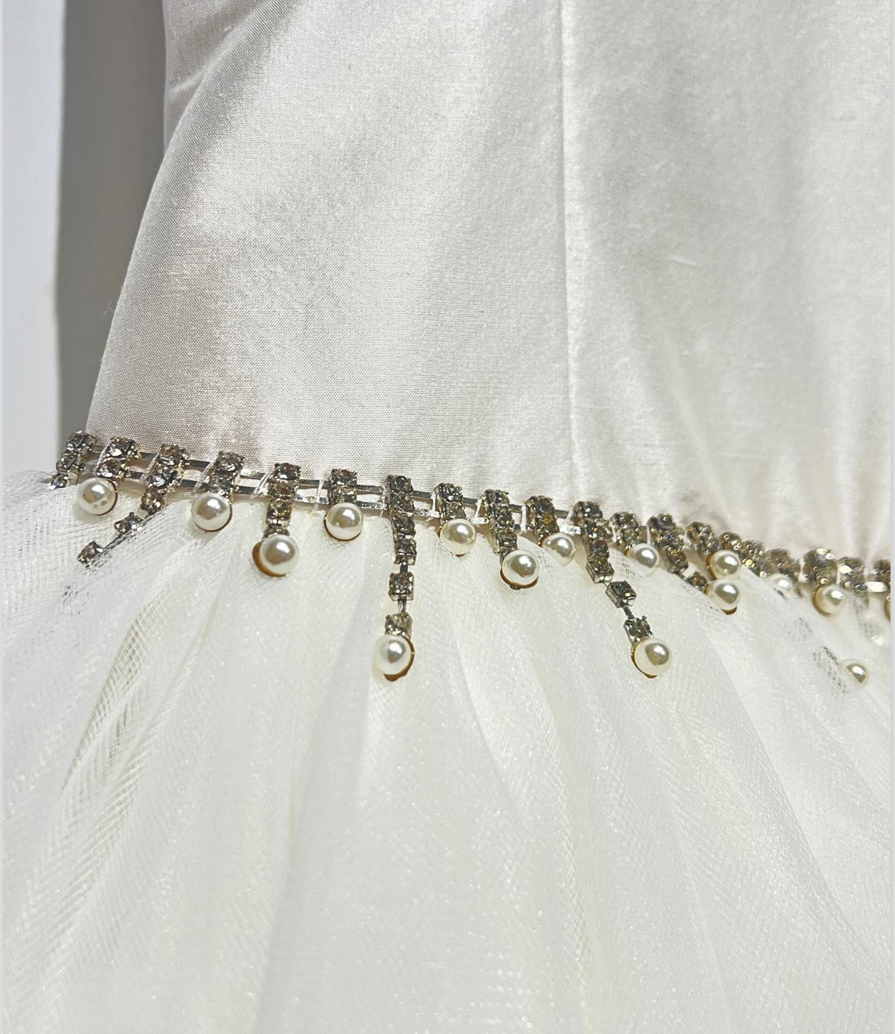 Платье Couture Margo от Christie Helene - изысканный выбор для торжественных случаев. Платье с атласным лифом без рукавов и объемным А-силуэтом имеет потрясающий квадратный вырез, украшенный вручную кристаллами и жемчужными бусинами. Изделие дополнено изящной застежкой на пуговицы сзади, что делает его идеальным для свадеб и торжественных случаев. Платье выполнено вручную и дополнено юбкой из тюля на подкладке для дополнительного комфорта.