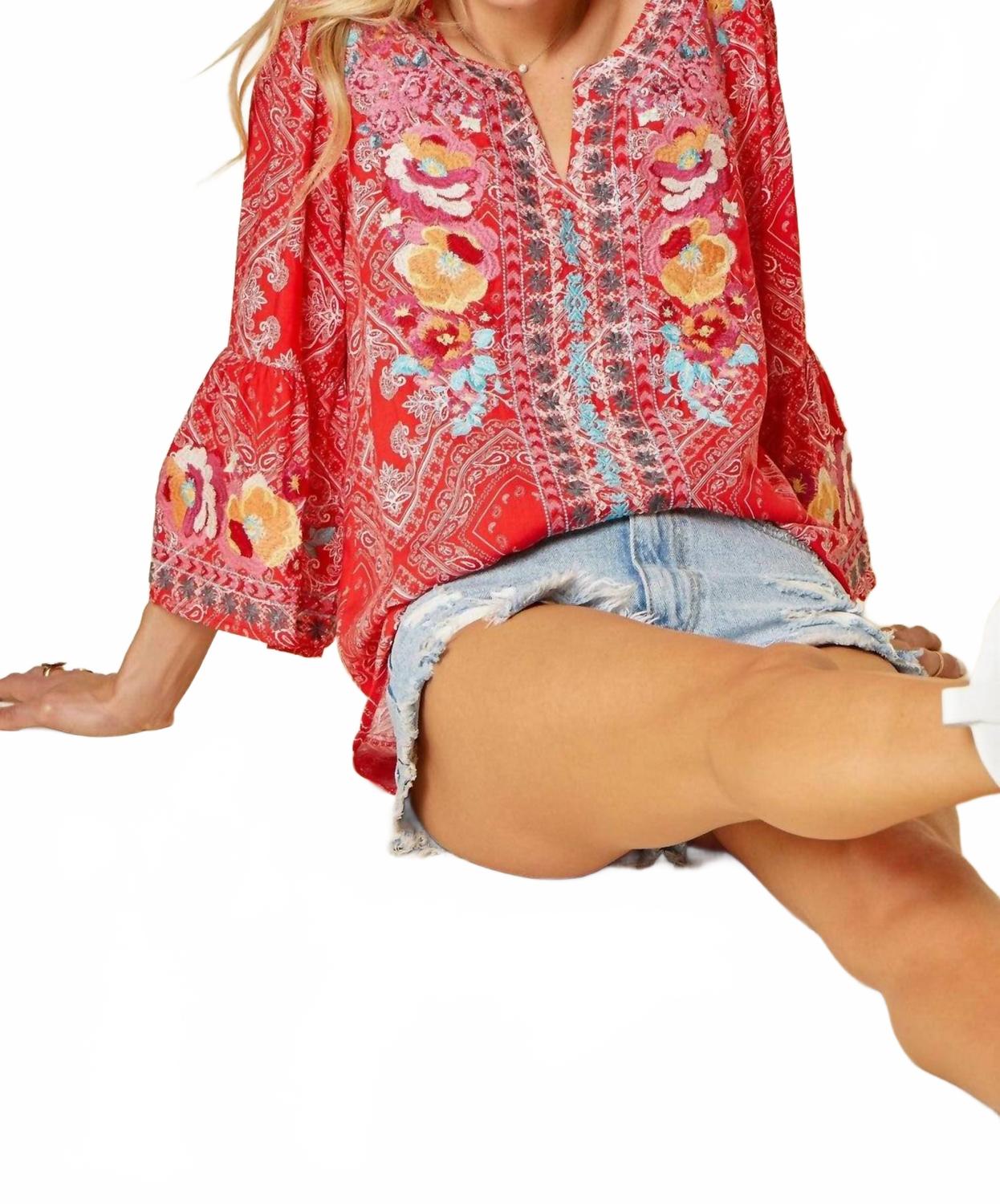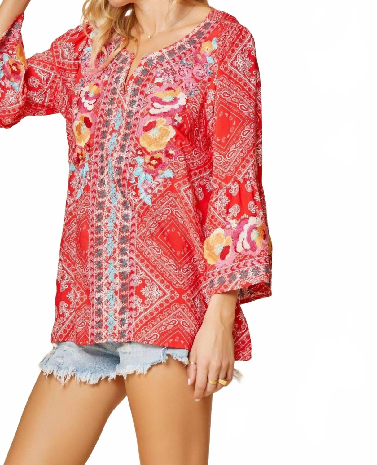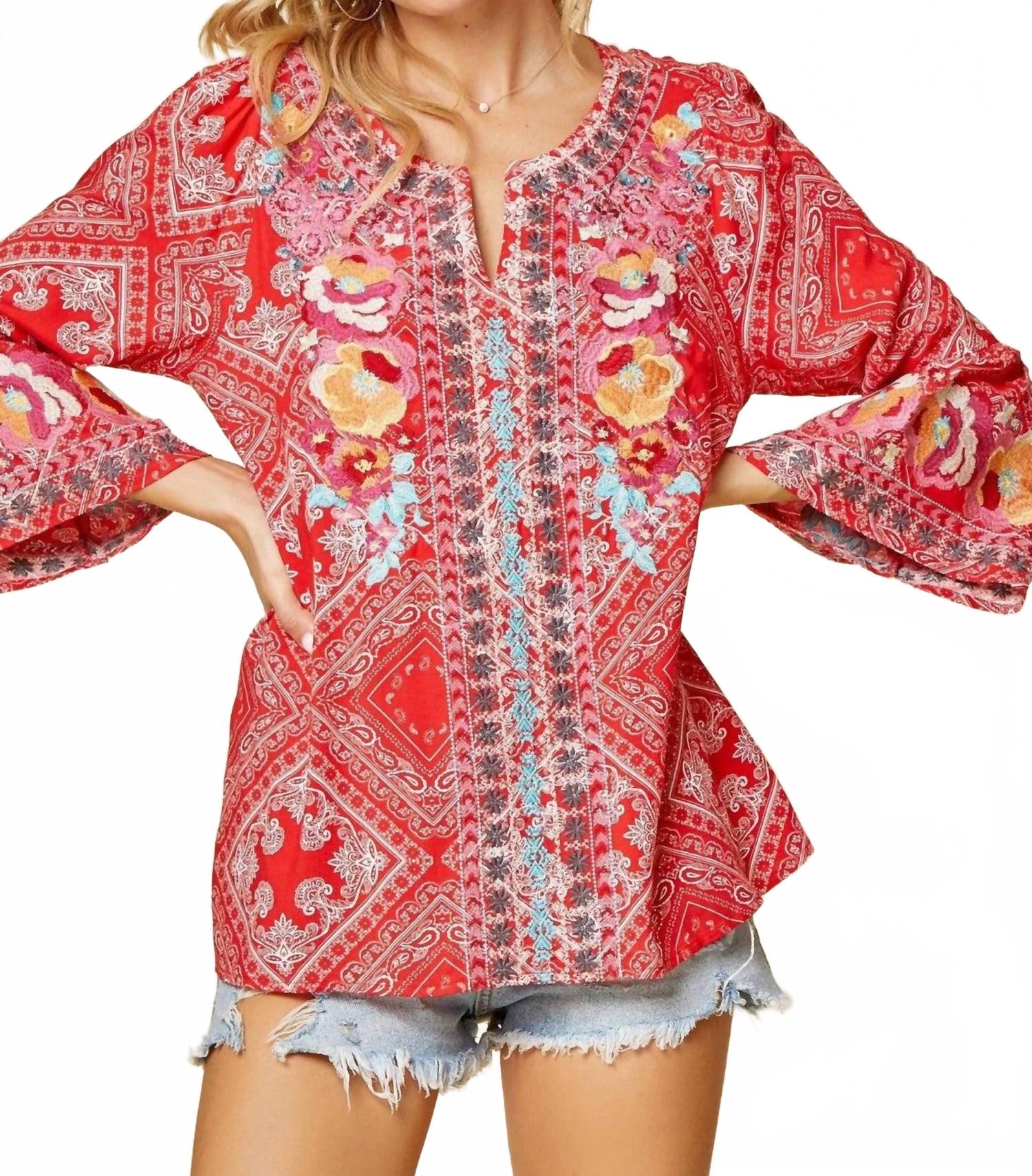 Сочетайте эту блузку с любимыми джинсами и шлепанцами для следующей девичьей вечеринки. Создайте стиль бохо-шик с вышитым топом «Бандана» от ANDREE BY UNIT, который идеально впишется в ваш летний гардероб. Эта блузка с длинными расклешенными рукавами и V-образным вырезом с разрезом выполнена из 100% вискозы, что обеспечивает свободный крой и не растягивается. Яркий красный топ украшен красочной вышивкой, придающей женственность, и имеет удобный дизайн, который легко надевать. Уход за этой блузкой с узором: ручная стирка в холодной воде. Доступны различные размеры от S до 3X, обхват груди от 40 до 56 дюймов (100-145 см) и длина изделия от 27 до 29 дюймов (61-69 см).