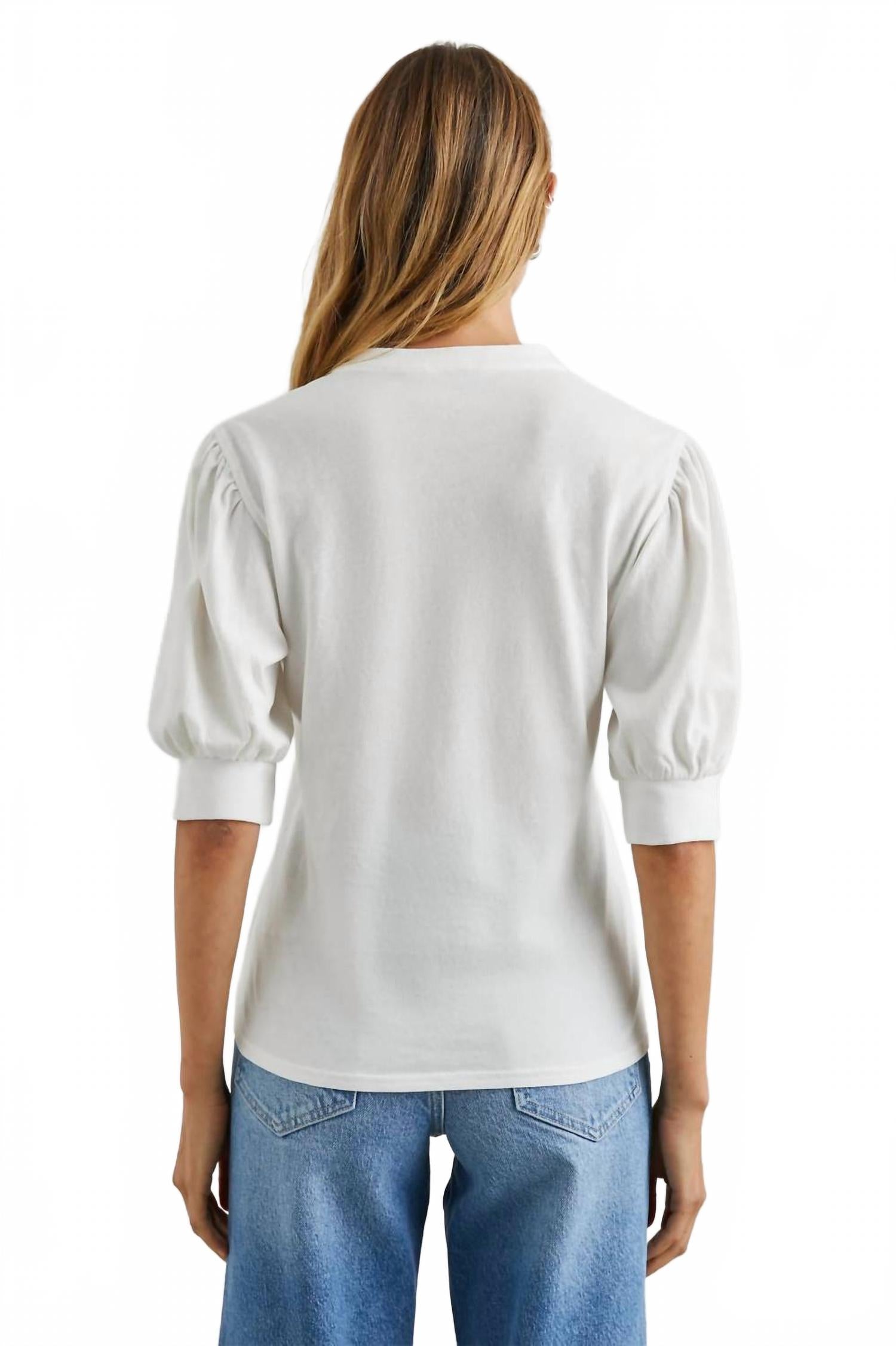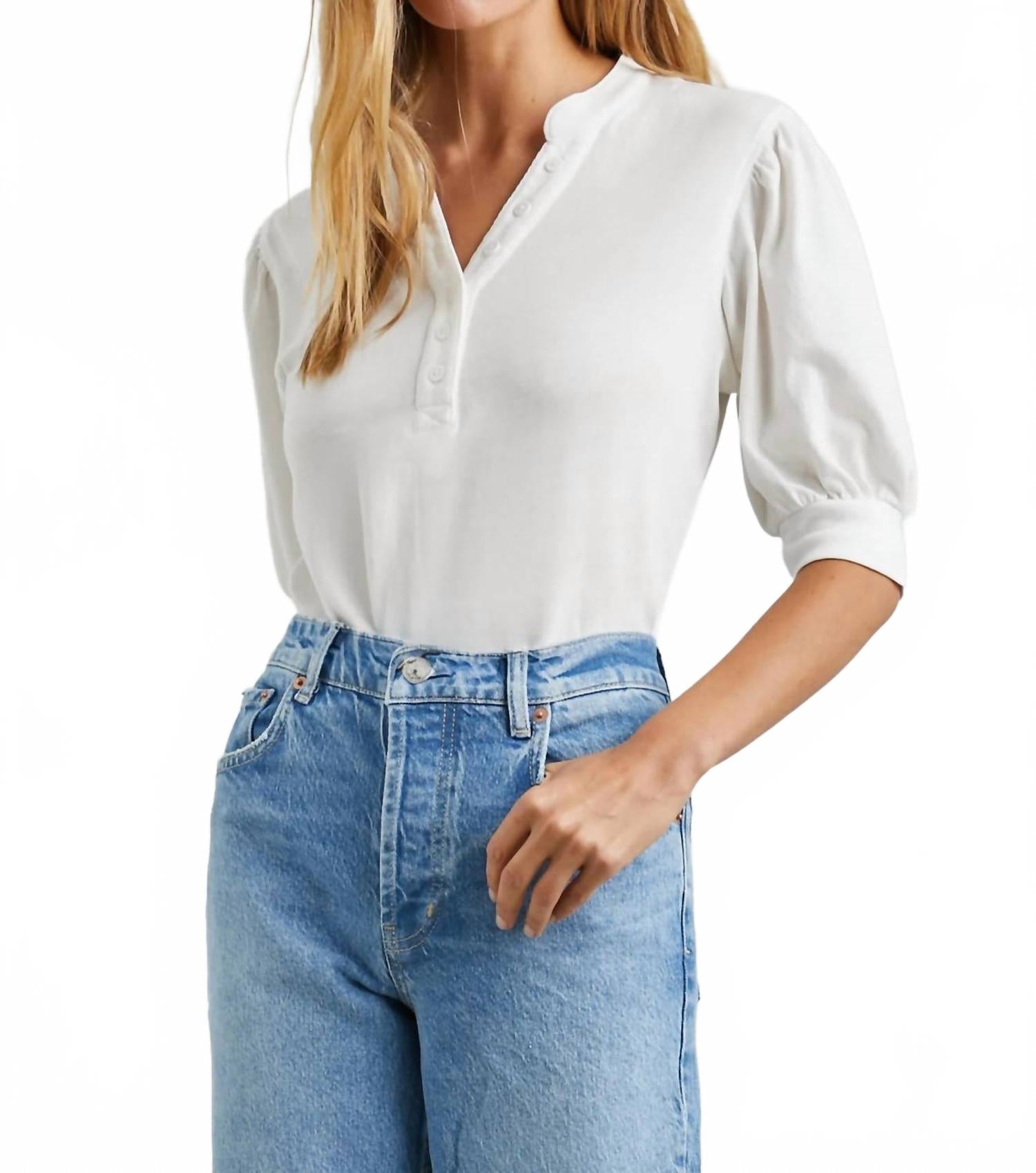 Не ищите дальше - вы нашли свою идеальную футболку! Дополните свой летний образ белой футболкой Jewel Top от Rails с пышными рукавами до локтя и V-образным вырезом, создающим легкий минималистичный образ. Эта футболка изготовлена ​​из 100% хлопкового винтажного джерси, что обеспечивает комфорт и ощущение носки. Планка с пуговицами длиной в четверть длины добавляет элегантности этой прочной вещи. Для ухода за ней стирайте в стиральной машине в холодной воде, вывернув наизнанку, в мешке для стирки, не отбеливайте и сушите в стиральной машине при низкой температуре. Длина переда: 23 дюйма (58 см) для размера S.