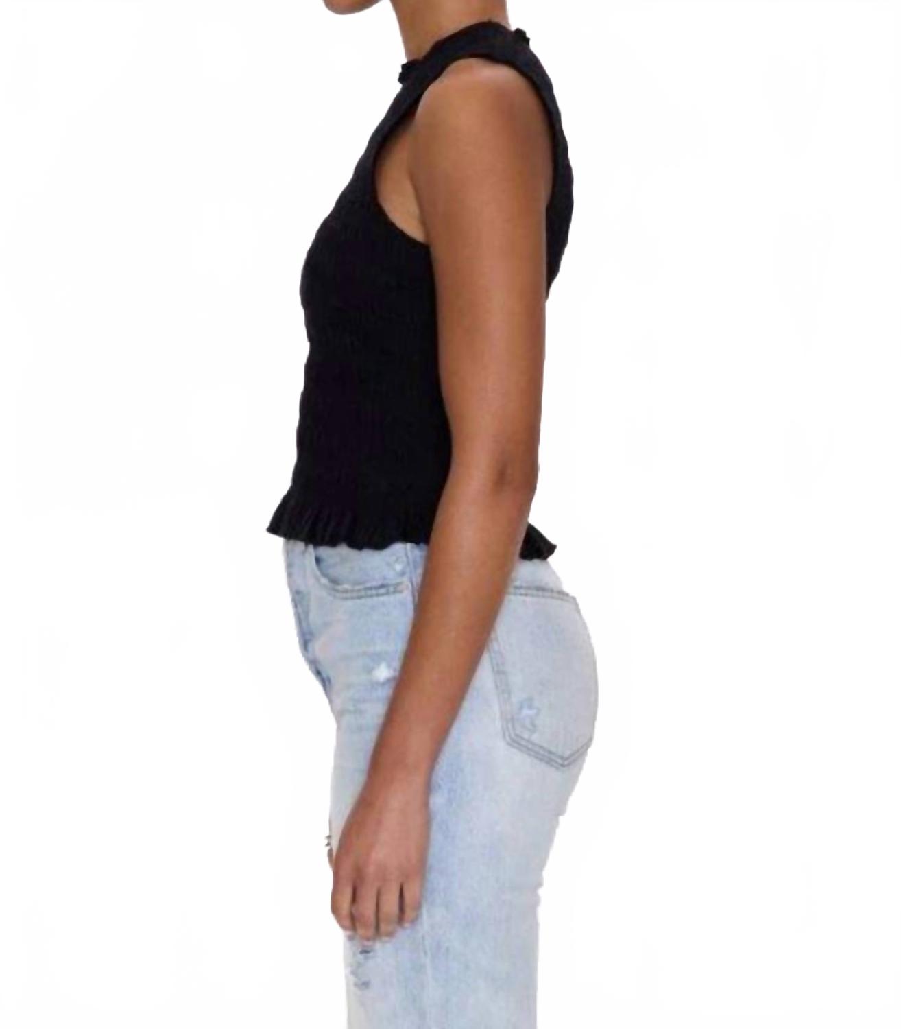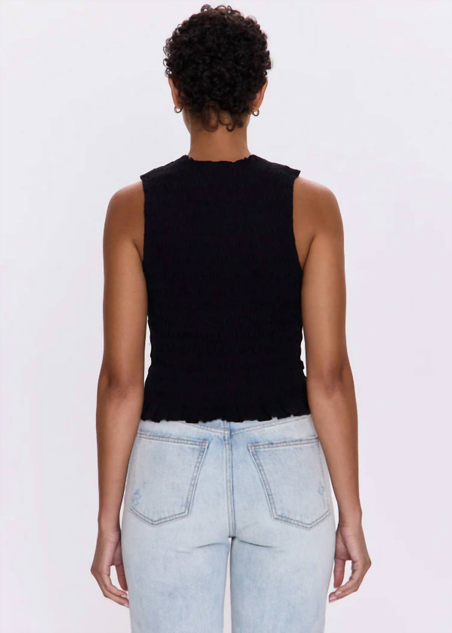 Представляем майку Pistola Phoebe Smocked в цвете Noir - стильное дополнение к вашему гардеробу, идеально подходящее для летних путешествий. Эта майка без рукавов изготовлена из смеси 97% хлопка и 3% спандекса, обеспечивает комфорт и выгодно подчеркивает фигуру благодаря сборкам по всей длине. Модель имеет круглый вырез горловины и универсальный однотонный узор. Длина майки - 50 см. Она легко надевается благодаря застежке-липучке. Уход за этой незаменимой вещью: стирайте вручную и сушите на горизонтальной поверхности.