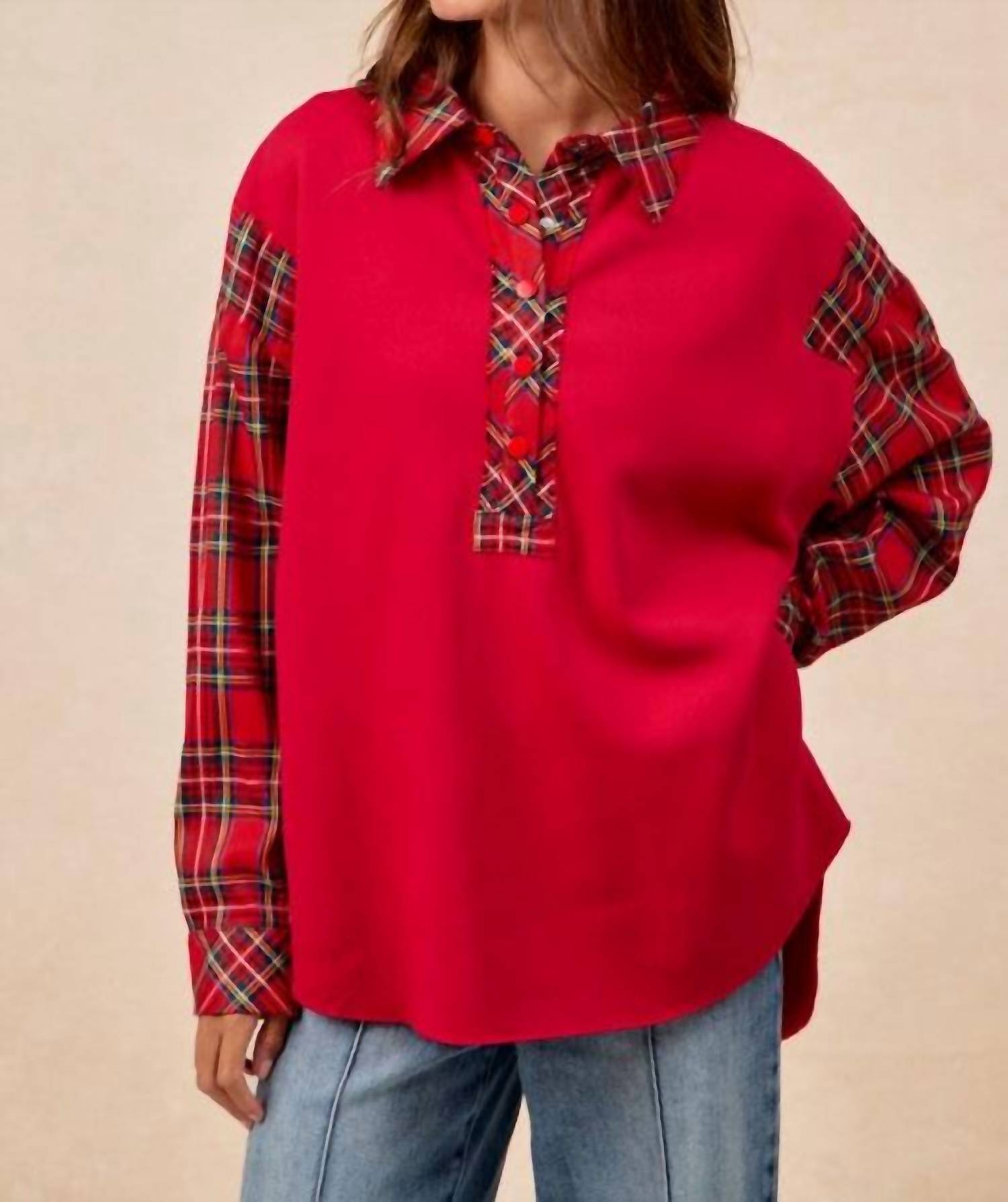 Идеальная посадка, милый дизайн, мягкая ткань. Вам понравится все в этой футболке с длинным рукавом. Отпразднуйте праздники в этом топе с воротником в рождественскую клетку от BiBi - восхитительном дополнении к вашему зимнему гардеробу в ярком красном цвете. Эта футболка с длинным рукавом изготовлена ​​из уютной хлопковой ткани, которая обеспечит тепло и комфорт во время праздничных вечеринок. Отложной воротник и застежка на полпуговицы создают атмосферу рождественских посиделок. Футболка без карманов легко поддается уходу: можно стирать в стиральной машине и сушить в стиральной машине.