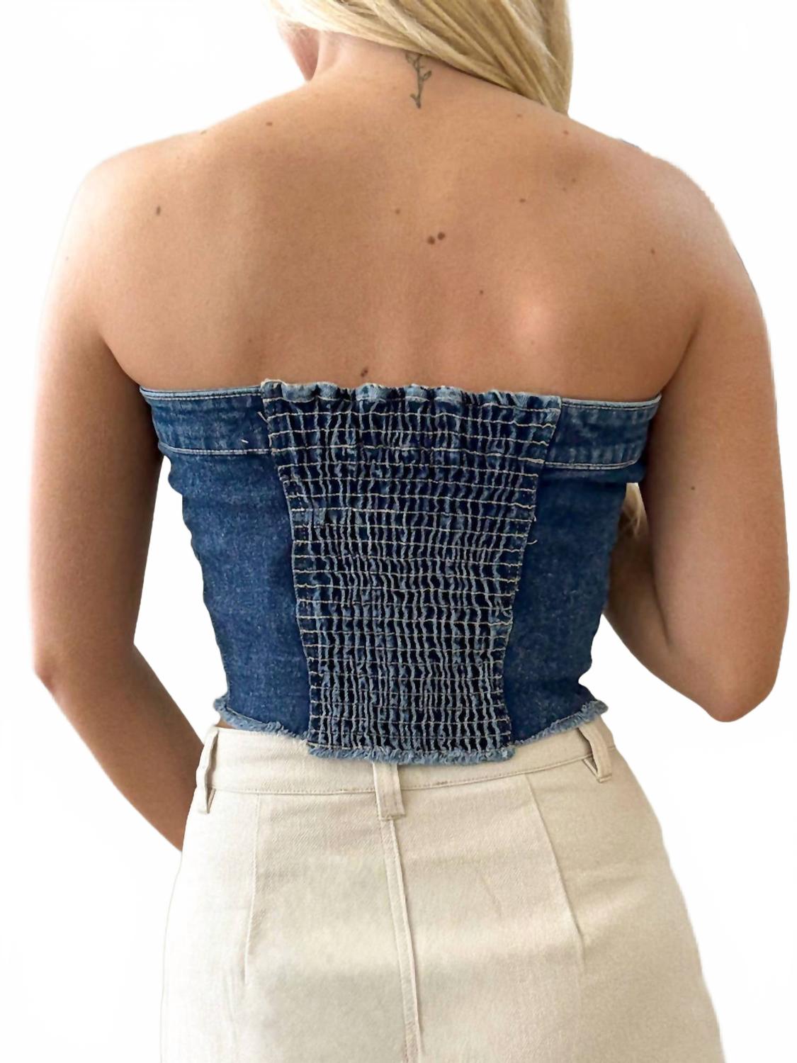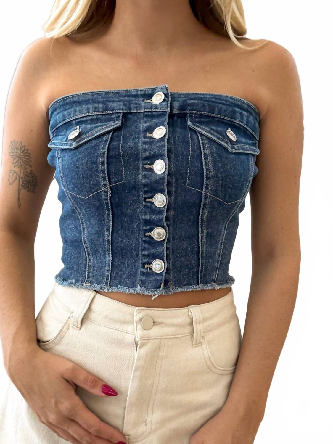 Сочетайте этот укороченный топ с любимыми джинсами с высокой талией или юбкой макси. Раскройте свой стиль с джинсовым топом Desert Drive от Timing - эффектным трикотажным бюстье, который дарит новый взгляд на комфорт и очарование. Эта прочная модель в уличном стиле без бретелек и облегающего силуэта дополнена застежкой на пуговицы и двумя передними карманами для дополнительной функциональности. Материал: мягкий трикотаж с добавлением эластичного денима обеспечивает гибкость и сохранение формы. Идеально подходит для женщин, стремящихся к яркому образу во время игр или летних мероприятий.