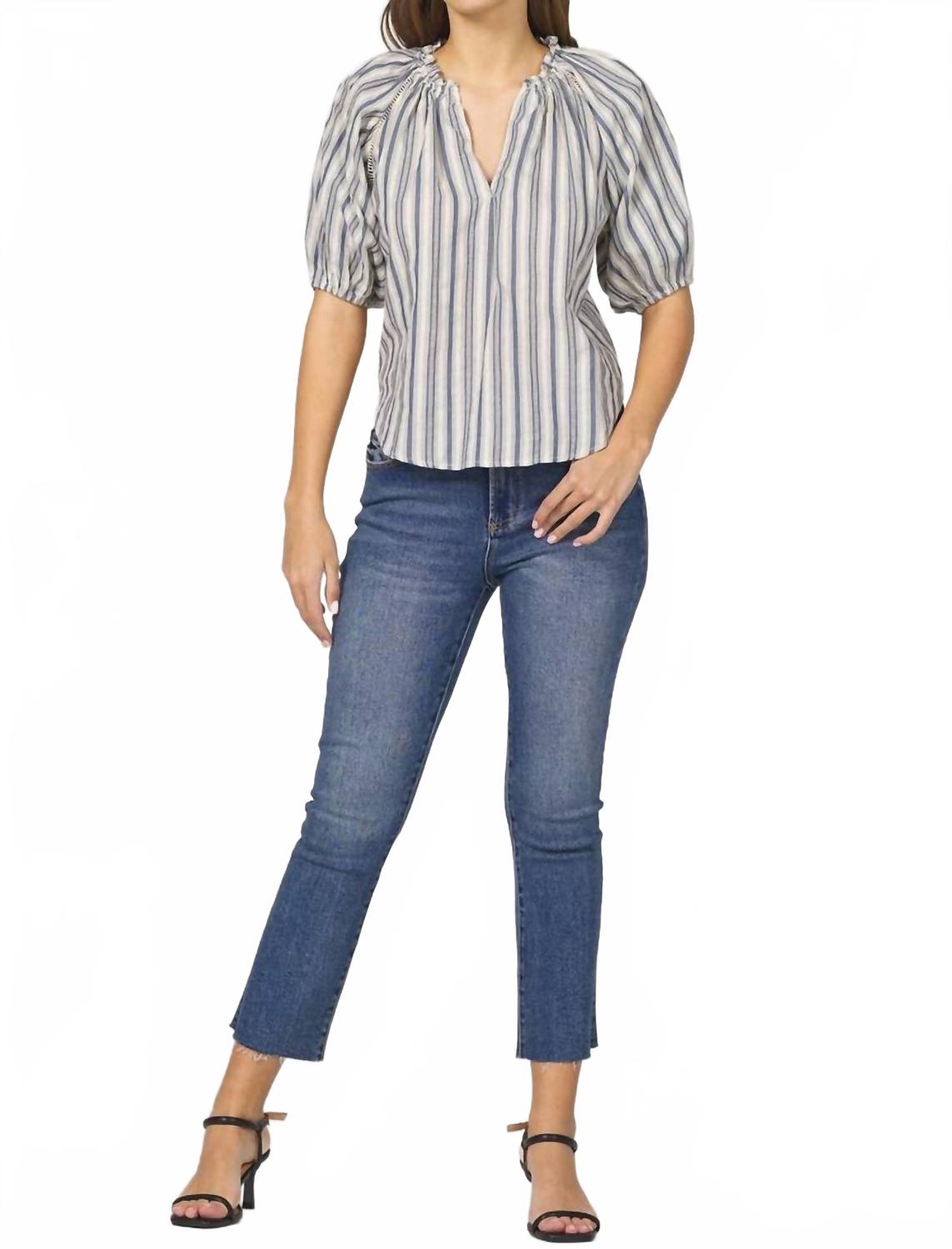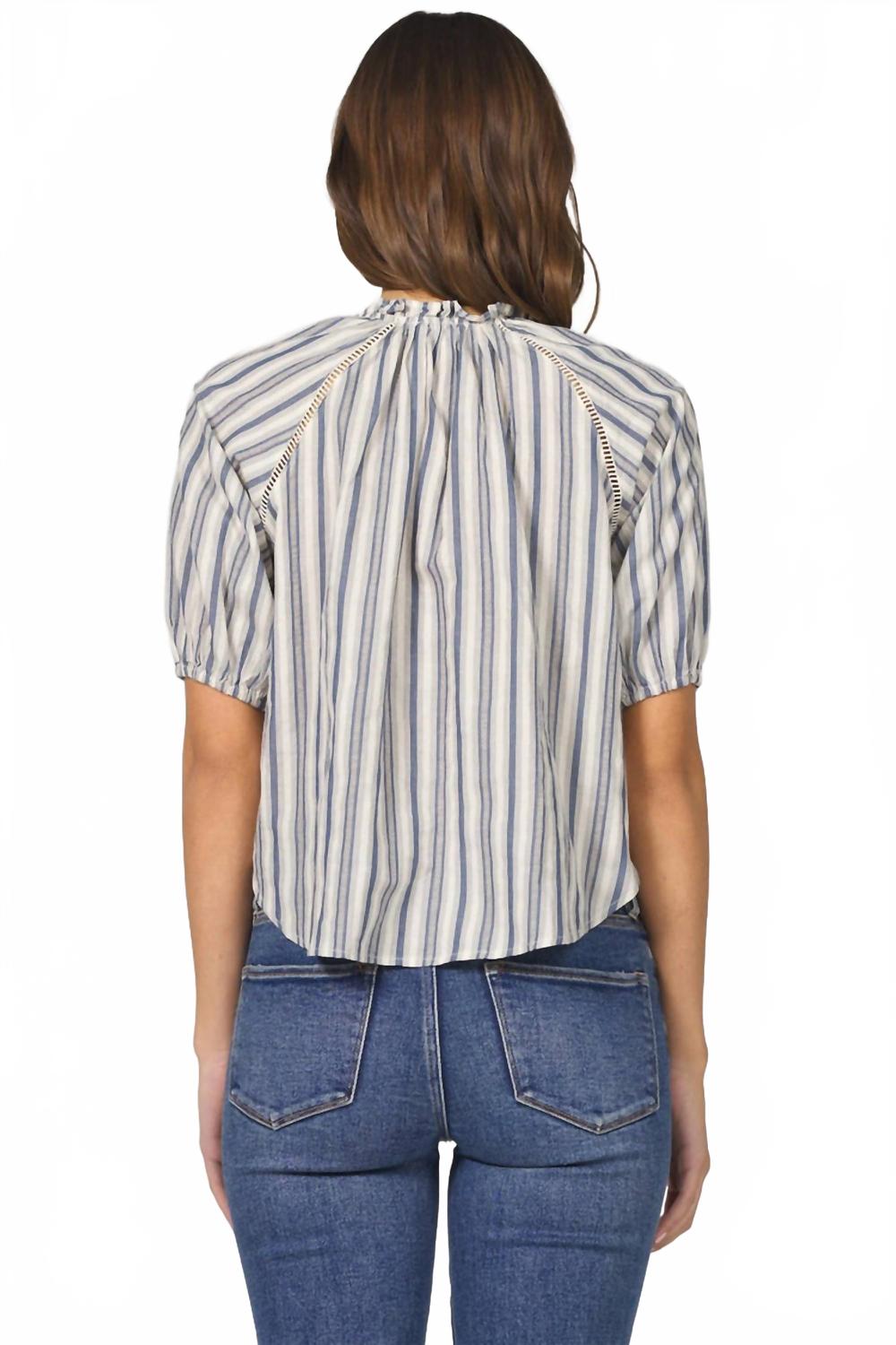 Универсальная блузка, которая подойдет как для работы, так и для ужина! Топ Costa Top от DEAR JOHN DENIM в темно-синей полоске - стильный выбор для осени с уютным прибрежным настроением. Этот топ с короткими рукавами и женственным V-образным вырезом, собранным из смеси 66% полиэстера и 34% хлопка, имеет короткие рукава. Благодаря застежке-липучке, он обеспечивает свободный крой, идеально подходящий для многослойной одежды. Отдайте предпочтение винтажным трендам и вступите в праздничный сезон в этой стильной и удобной вещи, идеально подходящей для Дня благодарения и не только.
