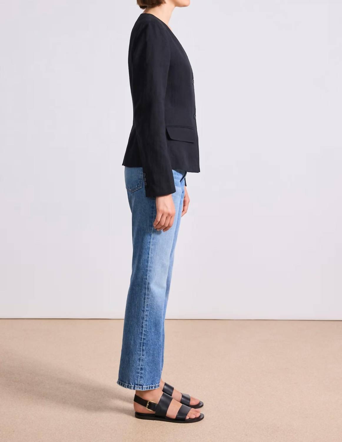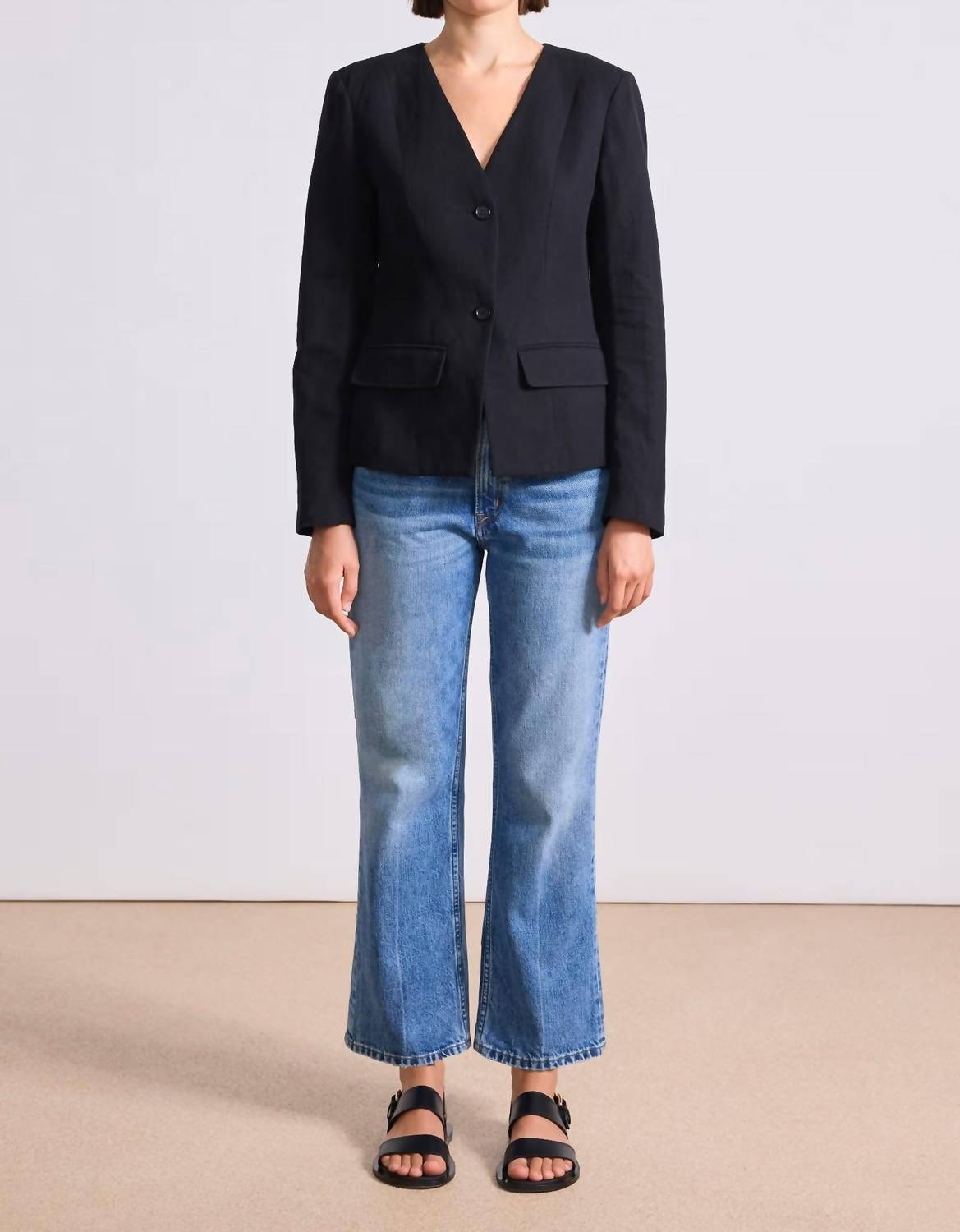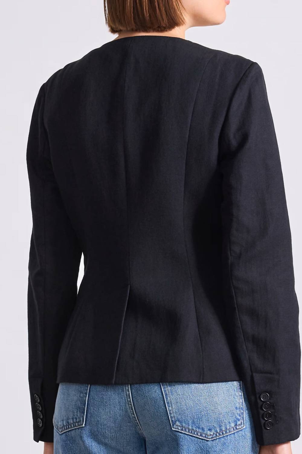 Этот идеально скроенный блейзер станет вашим незаменимым аксессуаром на долгие годы. Представляем топ-блейзер Asma от APIECE APART - изысканный выбор для осенних праздников. Этот универсальный черный блейзер с длинными рукавами, V-образным вырезом и облегающим лифом с ажурными швами выполнен из мягкой смеси 60% органического хлопка и 40% льна, с подкладкой из 100% хлопка. Его можно носить как рубашку на пуговицах или расстегивать поверх нескольких слоев одежды. Застежка - на две пуговицы. Для сохранения качества рекомендуется химчистка.